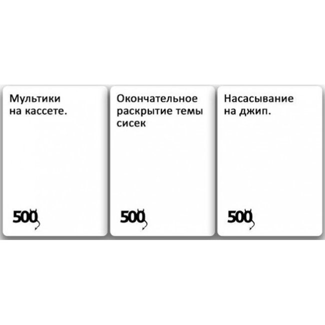 Ще й особливих правил для гри знати не треба: ведучий роздає гравцям по 10 білих карт з відповідями і просто зачитує пропозицію з пробілами на одній з червоних карток. Решта ж вибирають зі свого запасу слова і словосполучення, які на їх погляд (і на думку Петросяна) зроблять з початкової фрази мем року. Голосуєте своїм іржанням за самий прийнятний варіант (хоча останнє слово все-таки за провідним) і рухаєтеся далі в ліс, де на кожному кроці зустрічаються сучки, пеньки (поставте правильний наголос в попередньому слові) і незабутні гостроти. Набір «500 злісних карт» генерує тисячі жартів за короткий проміжок часу навіть у тих, кому максимум вдавалося видати з себе «Колобок повісився». Посперечайтеся, що ви не будете сміятися, граючи в «500 злісних карт» - і навчитеся легко розлучатися з грошима.