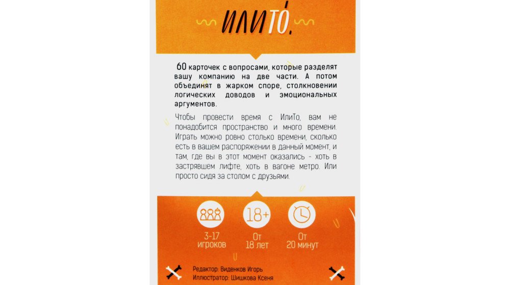 Що б ви обрали: щоб всі ваші органи чуття погіршилися на 50% або повністю втратити одне з п'яти почуттів? Скажете, дивне запитання? І матимете рацію. Так само і в тому, що цей вибір надзвичайно складний. А тепер уявіть, що вам потрібно переконати когось, що лише один з варіантів відповіді вірний. Ось тут-то і починається найцікавіше: палкі промови, хитрощі, квапливий пошук аргументів. В цьому суть захопливої словесної гри для вечірки «ИлиТо» від GaGa Games!
