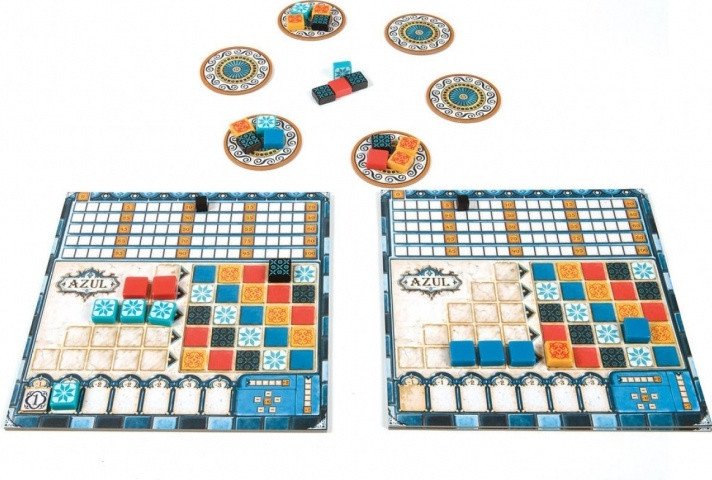 Вам належить позмагатися в цьому декоративному мистецтві, вибираючи з вітрин різних фабрик яскраві кахлі та розміщуючи їх потім на індивідуальних планшетах. Але як ви можете здогадатися, робити це 2-4 гравцям треба спеціальним способом. Наприклад, збирати можна лише плитки одного кольору, а на планшеті, крім самої стіни для заповнення мозаїки, є проміжний склад, де теж діють особливі правила. Так що «Azul (Азул)» — це ще та головоломка, яка до того ж своїм приголомшливим оформленням подарує всім учасником непередавану естетичну насолоду!