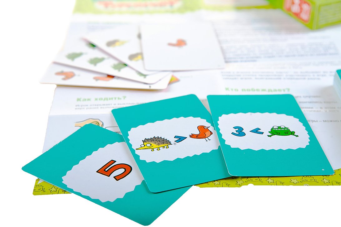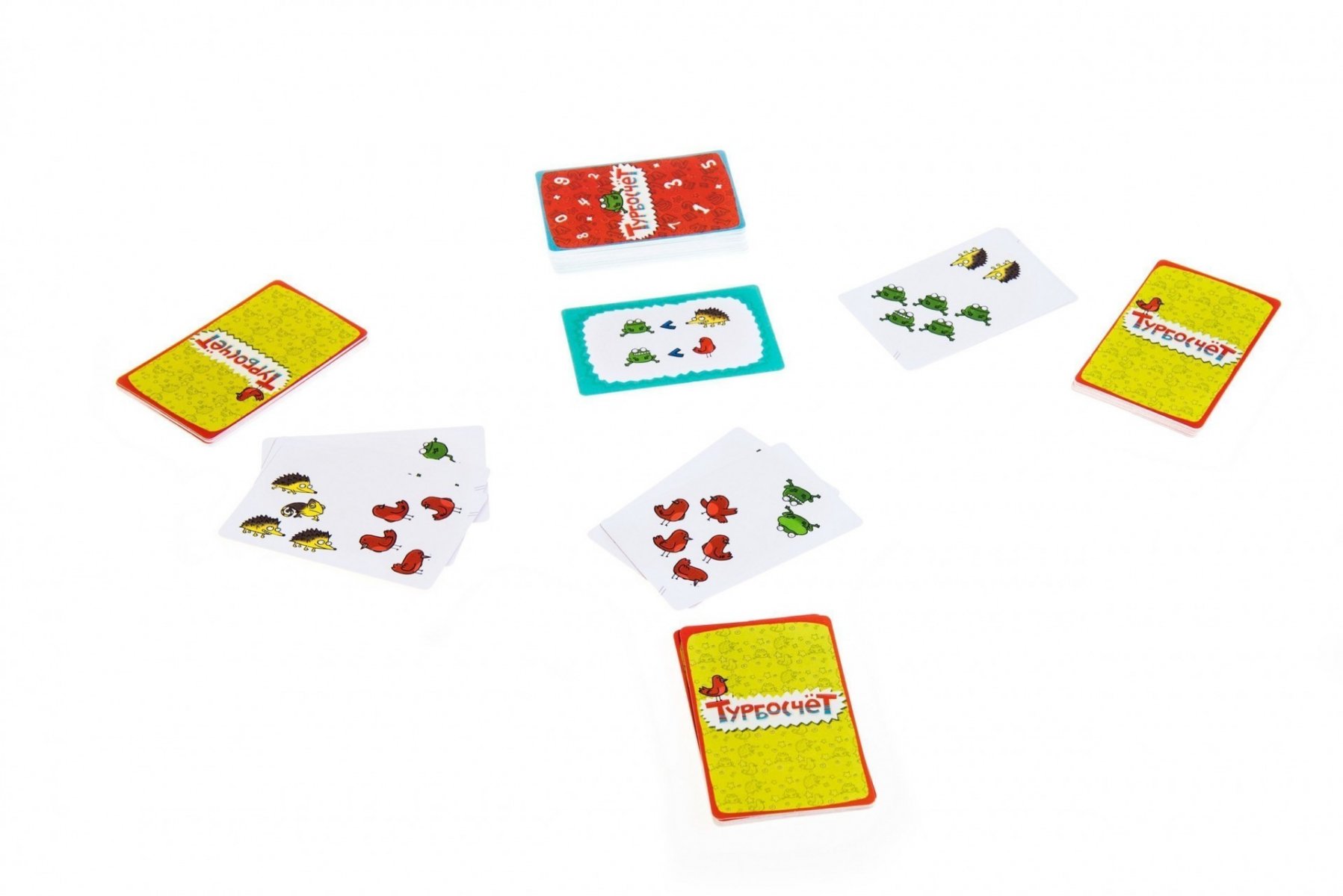 У яскравій компактній коробці з грою «Новорічний Турбосчёт» ви знайдете набір з 54 карт із смішними тваринами і 24 карт із завданнями. Симпатичні їжаки, жаби і пташки представлені на картах в різних кількостях, а на картках із завданнями різної складності ви знайдете цифри і вправи на порівняння кількості тварин (як між собою, так і з заданим числом).