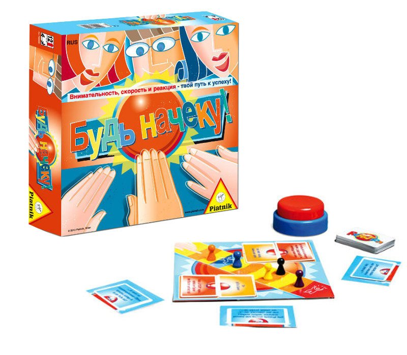До 8 гравців сідають навколо великої червоної кнопки і по черзі виконують різноманітні веселі умови на картках. Гра прекрасно тренує пам'ять, уважність і реакцію, адже потрібно пам'ятати про всіх завданнях самому і стежити за іншими гравцями. Хто помітив забудькуватість суперника - тисне на кнопку і переміщує свою фішку на 2 поділу вперед. Мета гри «Будь напоготові» - дістатися до фінішу швидше за інших. Буде дуже весело!