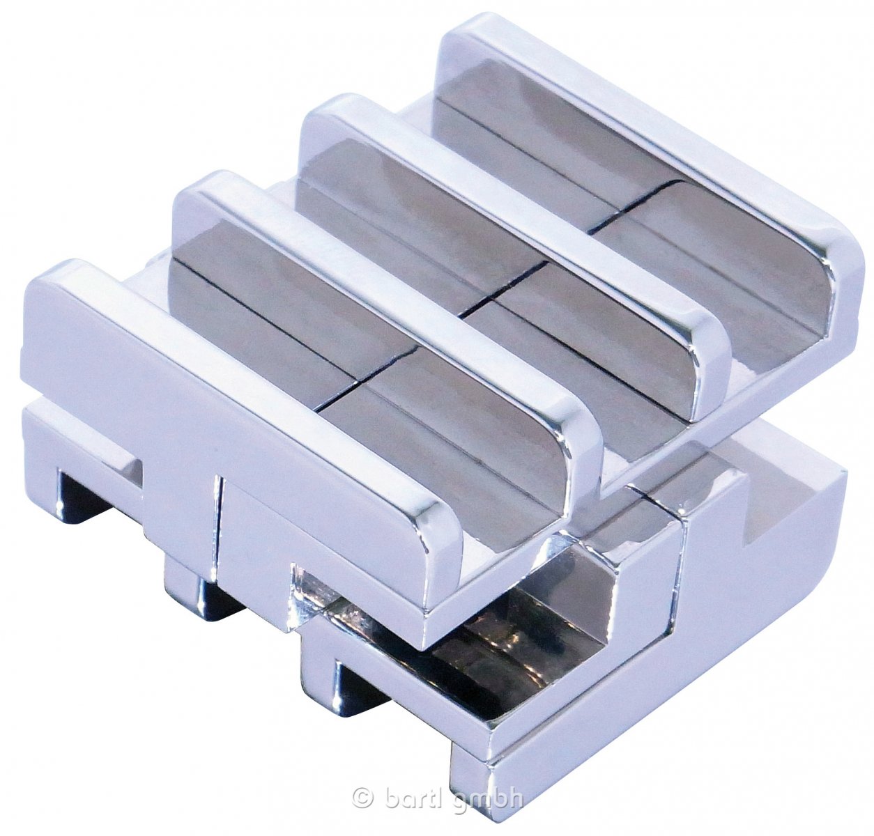 Чотири однакові, металеві деталі досить міцно тримаються один за одного, але проте вони рухливі. Вам має бути перевірити безліч логічних варіантів розгадки, щоб розібрати Cast Rattle. Рано або пізно завзятість і цікавість приведуть вас до правильних рухів частин головоломки, конструкція піддасться й легко розійдеться. Але остаточну перемогу над пазлом відсвяткуєте тоді, коли зможете повернути його в первісний вид.
