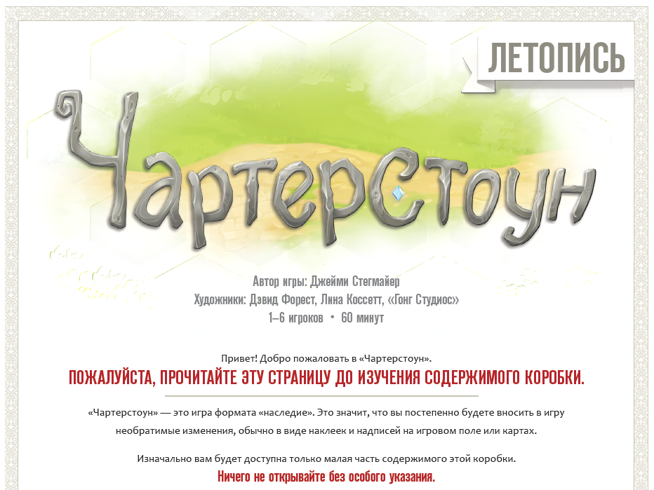 У наш магазин настільних ігор біля метро Мінська приїхала локалізація від Lavka Games однієї з найунікальніших настолок сучасності — настільна гра «Чартерстоун (Charterstone)». Це дітище Джеймі Стегмайера (творця такого хіта, як «Серп», що входить в 10-ку кращих ігор усіх часів і народів) не може виявитися звичайною грою.