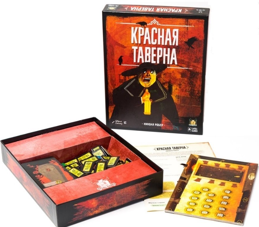 Ця карткова гра Ніколя Робера з дуже стильними ілюстраціями та великою часткою чорного гумору запрошує 1-4 гравців стати господарями того самого Червоного готелю! У коробці ви знайде 78 карт відвідувачів різних професій, рівнів, здібностей і розміру гаманця. Причому ці карти багатофункціональні: когось можна пограбувати та поховати, хтось допоможе побудувати затишне містечко для темних справ, а чиюсь лояльність доведеться купити за пару франків. У вас буде список можливих дій, з яких потрібно виконати тільки 2, звичайно ж не безкоштовно — витративши або гроші, або самі карти. Причому в настільній грі «Червона таверна (Красная таверна)» не можна тримати на руках 40 франків (мабуть, це небезпечно в даних обставинах), а непоховані трупи можуть призвести до арешту. Тому вам доведеться витратитися на послуги тіньового бухгалтера або понаднормові для могильника, а це потребує грошей та дій.