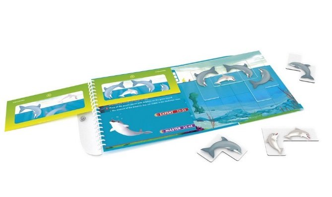 О цей таємничий підводний світ! Що відбувається в океанських глибинах? У магнітній головоломці «Дельфіни-акробати» від Smart Games дітям старше 7 років потрібно самостійно здогадатися, що ховається під водою. Ця розвивальна дорожня гра включає 7 магнітних елементів різної форми із зображенням дельфінів різних розмірів і буклет з 48 логічними завданнями. Кожне завдання показує тільки те, що видно над водою, тому розмістивши частину дельфінів, як зображено на картинці, гравцеві належить знайти місце для всіх елементів, що залишилися. Таким чином «Дельфіни-акробати» прекрасно тренують логіку, концентрацію і дрібну моторику вашої дитини, а також стануть відмінною грою в дорогу або подорож!