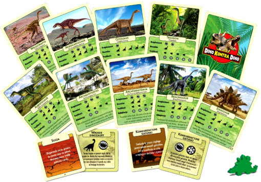 З розвиваючою грою «Дино VS Дино» діти старше 6 років зможуть поступово дізнатися багато нового про доісторичних ящерів, а також потренувати свою логіку. У коробці з грою ви знайдете 45 карток із зображеннями реальних динозаврів і зазначенням їх особливостей, одну дерев'яну фігурку стегозавра, а також 30 карток різноманітних подій. Щоб перемогти в «Дино проти Дино» гравцеві треба враховувати властивості кожного динозавра і ситуацію на ігровому столі. Це буде дуже цікаво і сподобається всім любителям динозаврів (тобто практично кожній дитині та навіть дорослим). Крім того, всередині коробки «Дино VS Дино» ви знайдете подарунок — двосторонній постер з улюбленими героями!