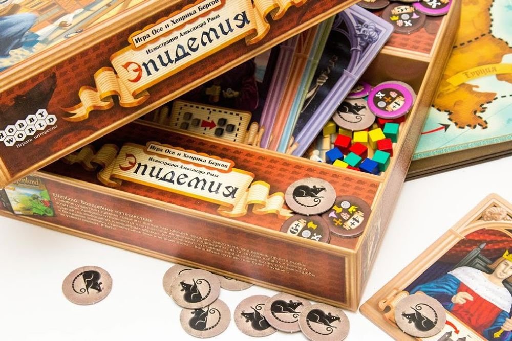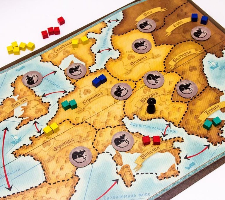 Подорожувати в середині 14 століття по Європі - це, на жаль, не музеї дивитися і Селфі робити, адже безжальна чума швидко набирає обертів. Але в настільній стратегії «Епідемія» у вас є шанс врятувати якомога більше народу і, звичайно, захоплююче провести час! Завдання гравців - заповнювати країни Європи своїм населенням, у вигляді кубиків обраного кольору, і зберегти якомога більше людей до кінця гри. В цей час по карті подорожує чорна фігурка чуми - вона додає в сусідні регіони жетони із зображенням щурів, до наявних початковим, і не обіцяє нічого хорошого центру епідемії. Розкриваючи жетони в цьому регіоні, в залежності від зазначених на них символах, гравці позбавляються певної кількості розташованих кубиків. Добре, що на допомогу можна взяти карту стану зі своїми унікальними властивостями, але і не без ризику втратити більше людей. Наприклад, відьми здатні підглянути значення 2-х жетонів (напевно в кришталевій кулі) і поміняти їх між собою, а король сховає один кубик у себе в замку. Вам знадобиться і стратегічне мислення, і уважність до дій суперників. А зважаючи на «чорну» тему, простий, але цікавий ігровий процес заражає не по-дитячому. Головне, місія - благородна, і ніхто не постраждає!