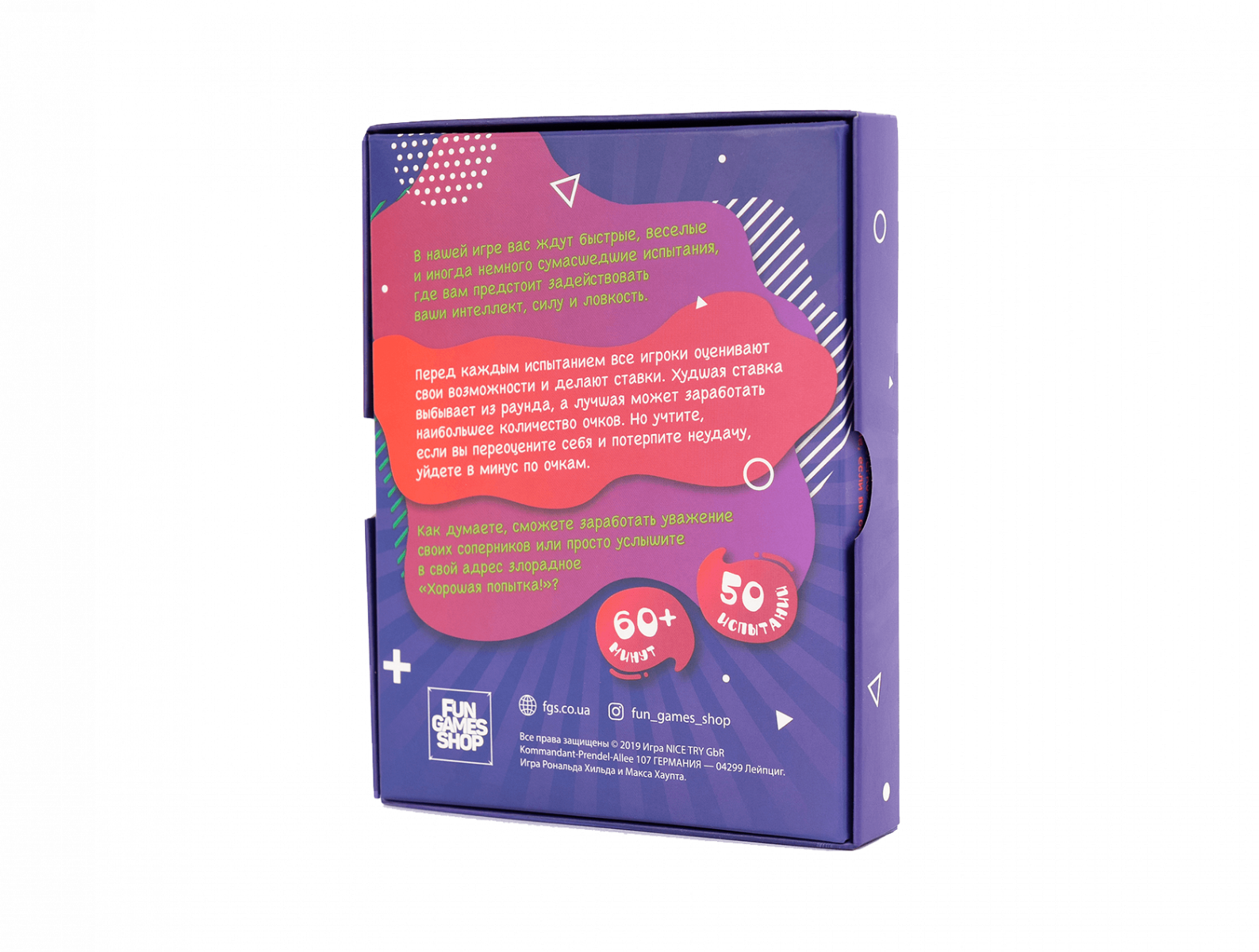 «Хорошая попытка» від Fun Games Shop — це проста, швидка і весела гра для вечірки або відпочинку в затишній домашній компанії, де вам не потрібно запам'ятовувати правила або перетворюватися на ельфів, дварфів і розбійників. Достатньо витягнути з колоди першу карту- випробування і зробити ставку! Так, в компактній коробці, крім бланків для зручності підрахунку очок, ви знайдете 50 карт з різноманітними завданнями, у виконанні яких вам належить позмагатися.