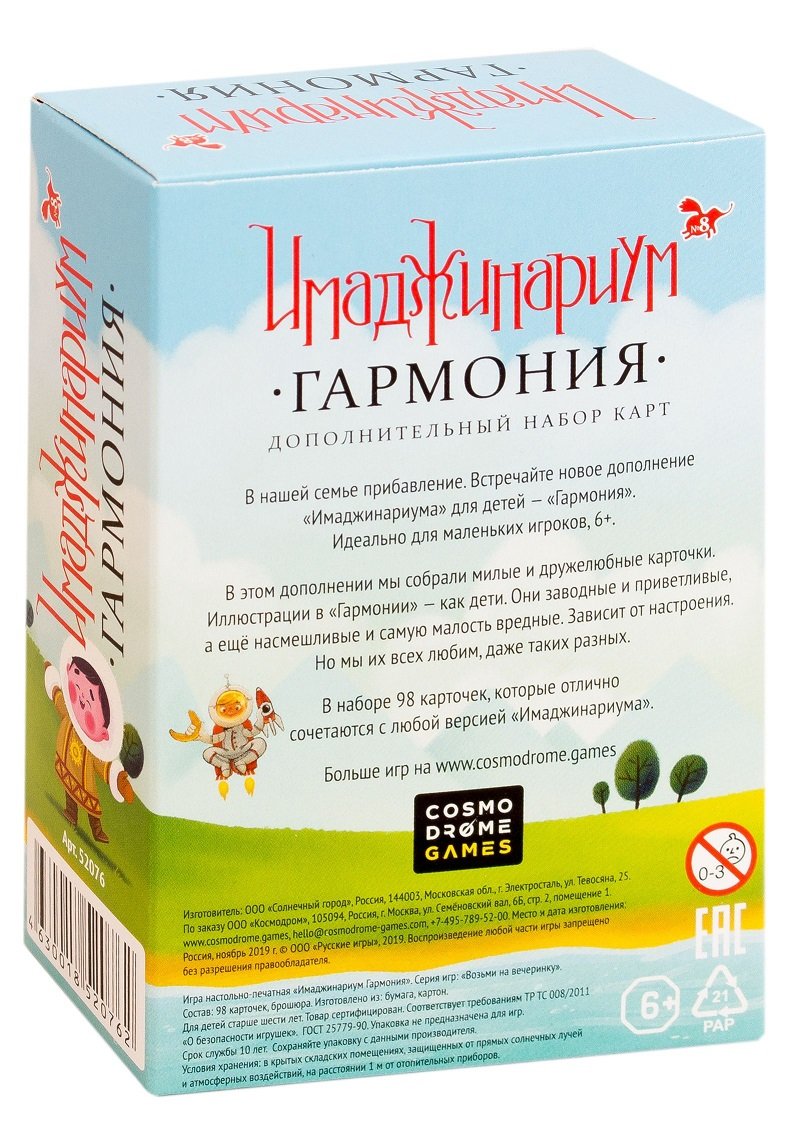Всі ми родом з дитинства. Та іноді так приємно знову в нього зануритися, особливо разом з малюками, які теж хочуть грати в «Імаджинаріум»! І тепер, завдяки новому доповненню «Імаджинаріум. Гармонія», ви зможете перетворити свій базовий Імаджинаріум в адаптований для дітей старше 6 років або розширити «Імаджинаріум. Дитинство», «Добро» і «Союзмультфільм». Адже це велике доповнення містить 98 наймиліших, доброзичливих, місцями пустотливих ілюстрацій, які тільки можна собі уявити. Вони викличуть у вашого малюка масу цікавих асоціацій і потренують його уяву. Крім того, з цим доповненням дорослі зможуть трохи подуріти як діти та згадати свої юні роки та мрії. «Імаджинаріум. Гармонія» чудово поєднується з іншими доповненнями серії, особливо — з доповненням «Касіопея» (сподіваємося, ви вже встигли його купити), яке також підходить для дітей від 6 років. Набір додаткових карт «Імаджинаріум. Гармонія» гарантовано додасть у ваші партії масу позитиву!