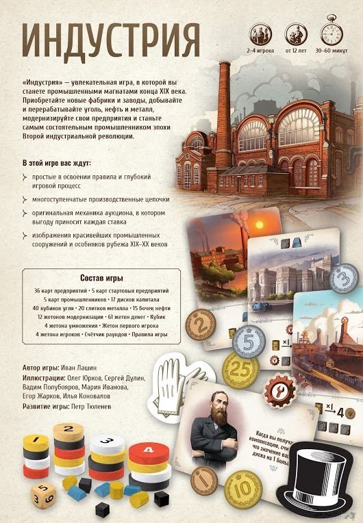 Ця новинка 2020 року від Івана Лашина і видавництва Hobby World дозволить 2-4 гравцям стати індустріальними магнатами на рубежі 19-20 століть. Причому в цій картковій стратегії вам потрібно буде не просто викуповувати різноманітні будівлі та заробляти ресурси. У грі «Індустрія (Индустрия)» ви будете боротися за ласі об'єкти на аукціоні, а з отриманих карт зможете будувати справжні виробничі ланцюжки, жонглюючи ресурсами та грошима.