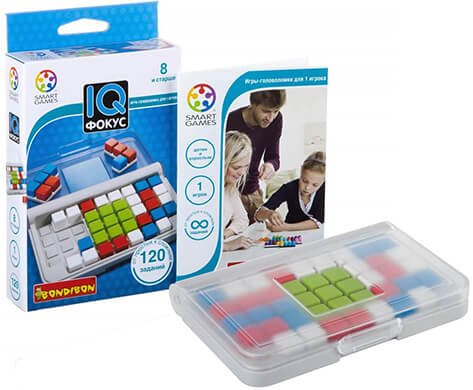 Як краще потренувати посидючість, уважність і кмітливість в такому юному віці? Звичайно ж, в ігровій формі! У цьому допоможе головоломка «IQ Фокус» від Smart Games. У дуже компактному органайзере (адже це також чудова гра в дорогу) ви знайдете конструктор з 10 різнокольорових елементів різної форми і буклет з 120 завданнями 4 рівнів складності.