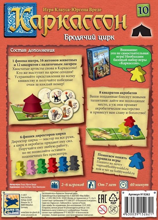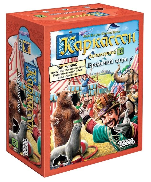 В якому сенсі, цирк поїхав, а акробати залишилися? У Каркассоні такого бути не може — адже всі вони подорожують разом, в одній коробці десятого доповнення «Каркассон. Бродячий цирк». Крім того, ця новинка містить 16 жетонів дресованих звірів, по фішці директора цирку для кожного гравця, мініатюру самого намету і 12 тайлів з новим об'єктом — наметовим містечком циркових артистів.
