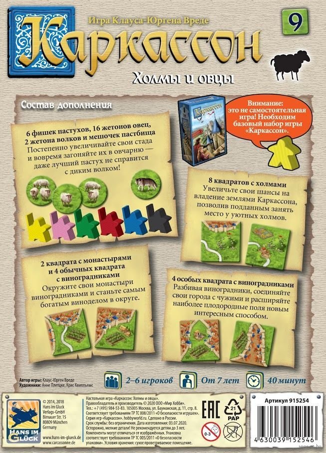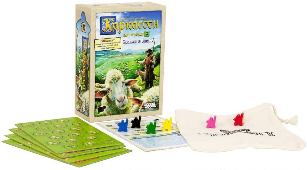 Побачивши назву доповнення «Каркассон. Холмы и овцы (Каркассон. Пагорби та вівці)», ви напевно подумаєте, що з ним у вашій улюбленій сімейній стратегії «Каркассон» з'являться пагорби та вівці. Чи не так? Хід Конем підтверджує — так і навіть більше! Крім жетонів з вівцями, ви отримаєте фішки пастухів, і виставивши такого міпла на тайл поля, гравці зможуть спробувати створити ціле стадо за особливими правилами. Але в тканинному мішечку також будуть ховатися такі ж за формою жетони з вовками, витягнувши які, ви можете втратити все стадо!