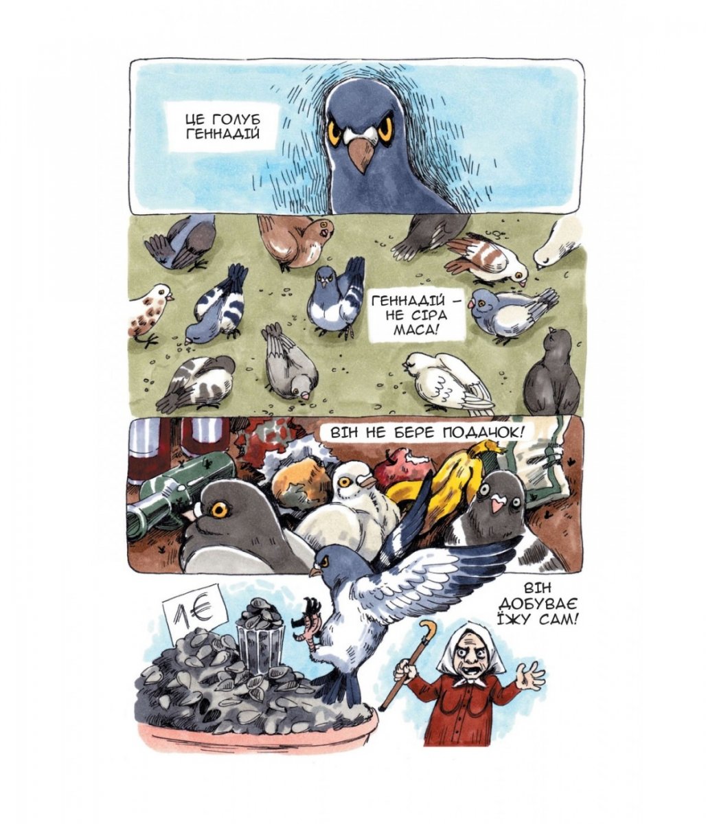Хоч Геннадій і голуб, але його часто турбує те саме, що і нас. Він не хоче бути просто сірою масою, замислюється про сенс життя і не планує поки мати дітей. Про його пригоди й умовиводи можна тепер прочитати не тільки на просторах інтернету, але й на сторінках друкованого видання українською мовою від Mal'Opus. Цей комікс з яскравими ілюстраціями та особливим гумором від Koro змусить кожного високоактивного соціопата реготати в голос (поки ніхто не чує), а шанувальників екзистенціального гумору — радісно плескати в долоні. «Голуб Геннадій. Том 1» дозволить вам по-новому подивитися на голубів, життя і хлібні крихти.