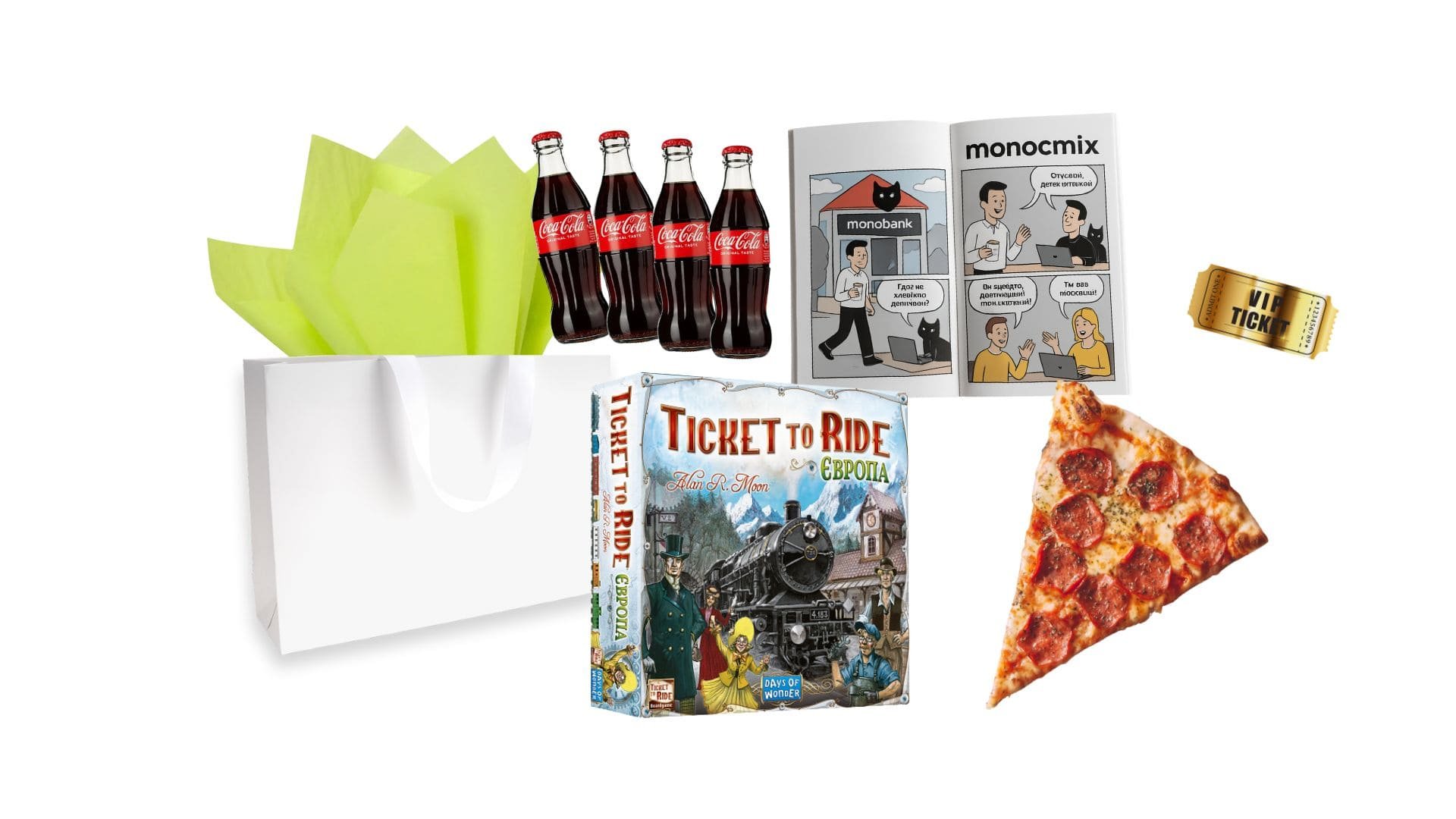 Щоб вечір був смачним і комфортним, ми додали сертифікат на піцу та набір Coca-Cola (4 шт) — класика дружніх зустрічей. А VIP квиток-лотерейка подарує елемент несподіванки й азарту. Усе це оформлено в подарунковий пакет із брендуванням, який відразу справить враження.