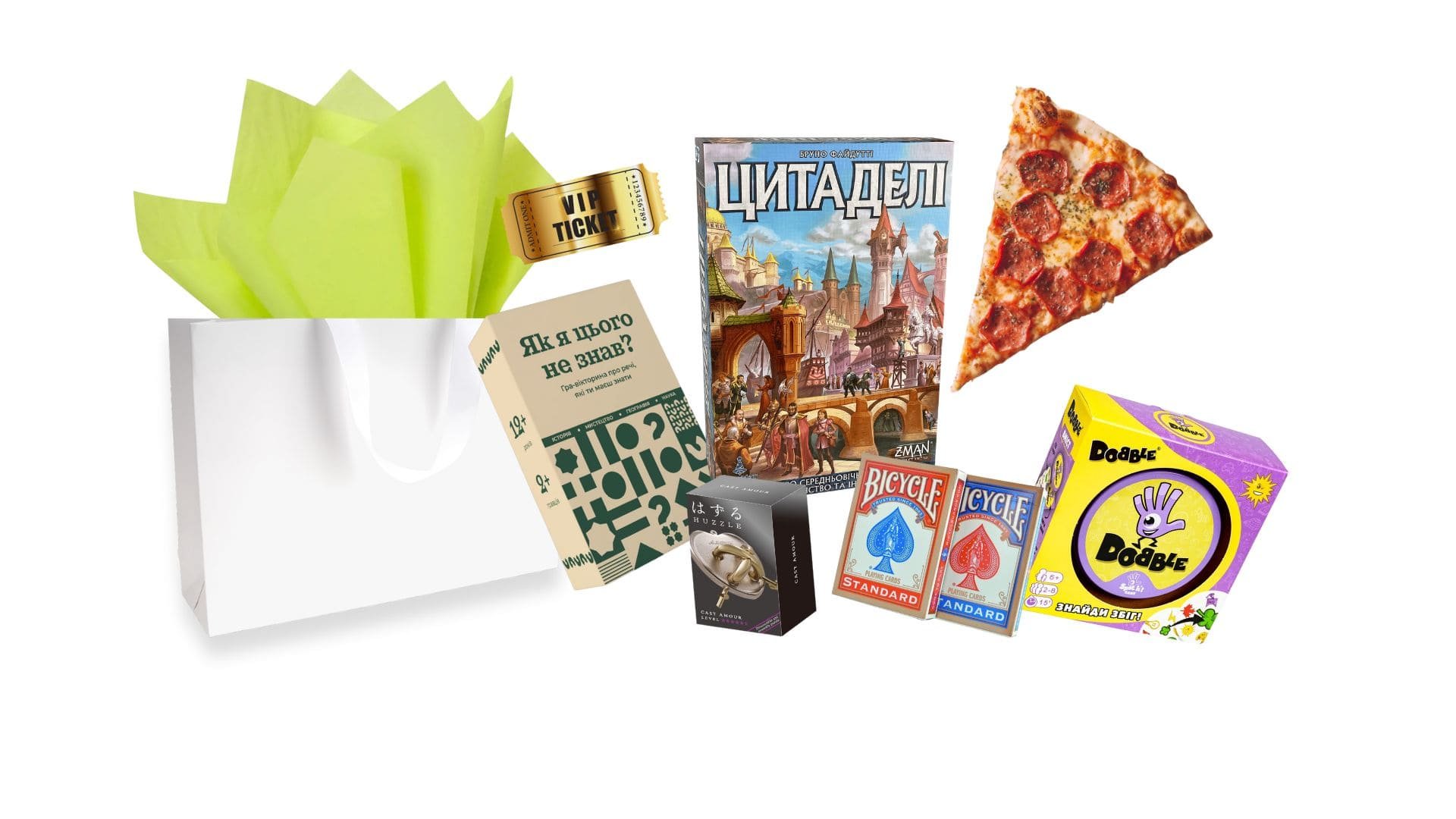 Щоб зробити вечір ще цікавішим, у наборі є головоломка Cast Huzzle, яка змусить добряче поламати голову. Для смаку й комфорту додається сертифікат на піцу — адже кращого доповнення до гри годі й шукати. А бонусом і приємною несподіванкою стане VIP квиток-лотерейка. Усе це — в стильному подарунковому пакеті з брендуванням, готовому здивувати будь-яку команду.