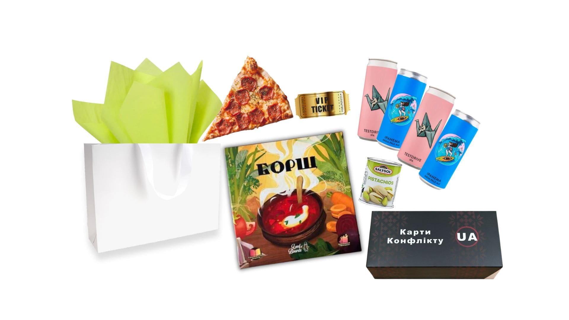 Цей набір створений для справжніх командних гравців, які люблять гучні корпоративи, драйв і вечори, що запам’ятовуються. Тут зібрано все, щоб будь-яка зустріч перетворилася на яскраву подію. Настільні ігри «Борщ»та «Карти конфлікту» подарують сміх і азарт у колі колег, а сертифікат на піцу стане чудовим бонусом для командної вечері.