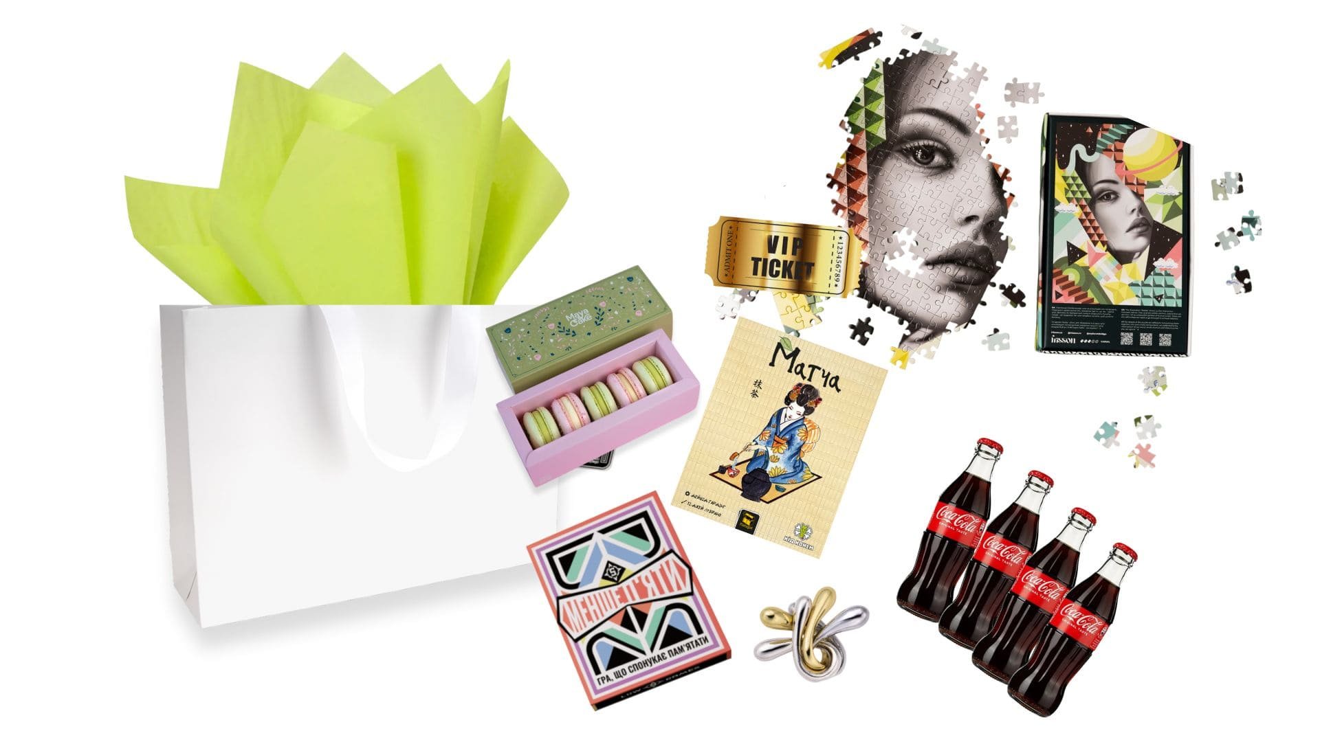 Для солодкого настрою додається набір макарунсів (5 шт) і класичний сет Coca-Cola (4 шт), які створюють відчуття справжнього свята навіть у звичайний вечір. А щоб розім’яти розум, у подарунку є головоломка Cast Huzzle Rittle та сучасний пазл FRISSON x Khvylya x Victory Lime. Приємним бонусом стане VIP квиток-лотерейка, яка додає несподіванки й азарту. Усе це запаковано у стильний брендований пакет.