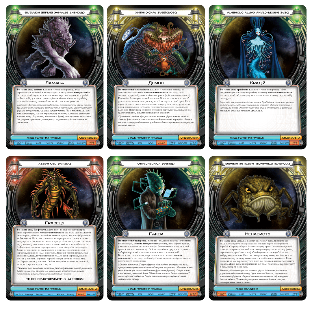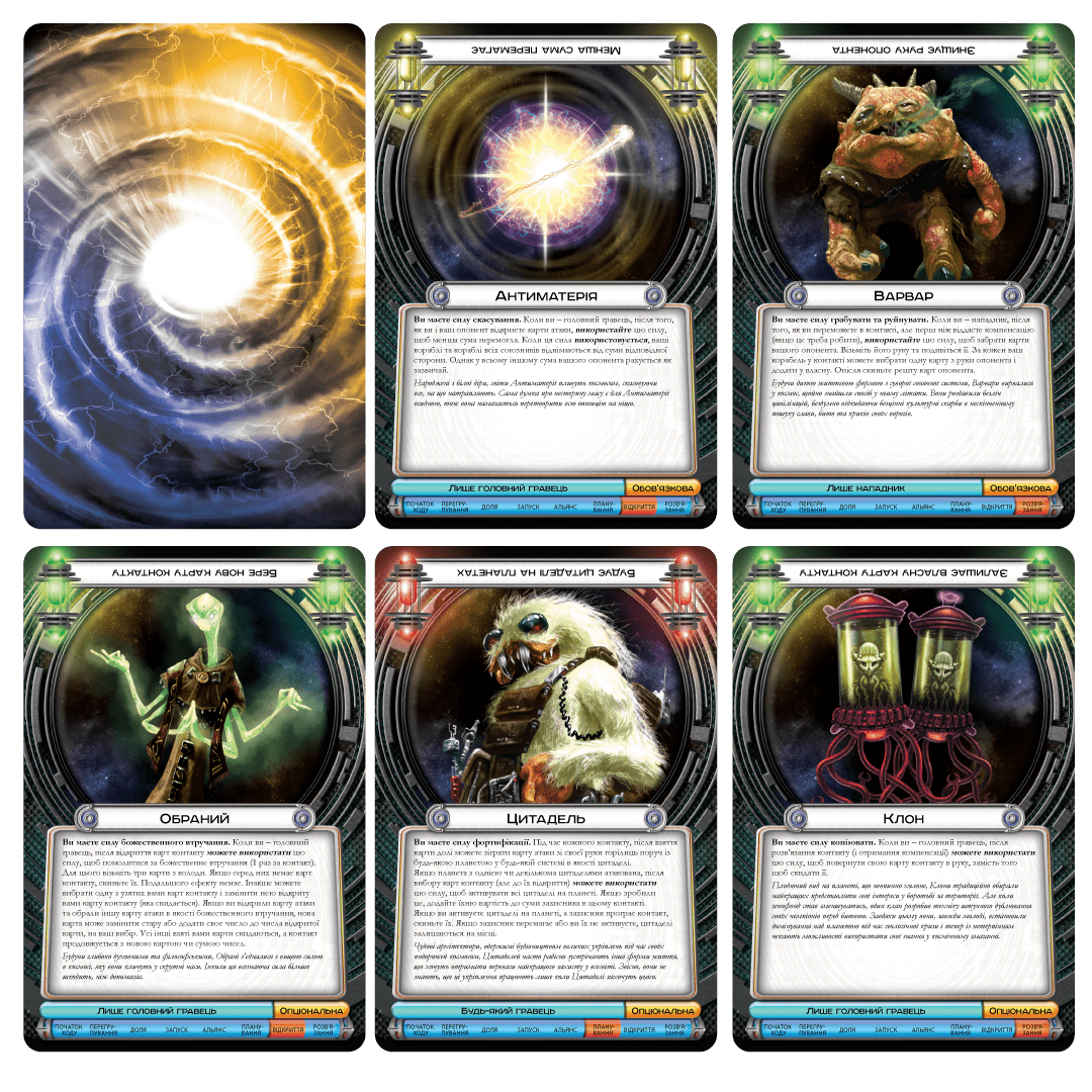 Чому "Космічний Контакт" — це гра, яка створює легенди у вашій компанії: Кожна раса прибульців має унікальну суперсилу, яка повністю ламає одне з базових правил гри! Уяви — хтось може брехати про свої карти, хтось перемагає, програючи битви, а хтось змушує суперників грати з відкритими картами. Це створює неповторний досвід кожної партії, який не порівняти навіть з Гегемонією, хоча глобальні амбіції там такі ж.