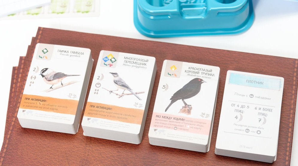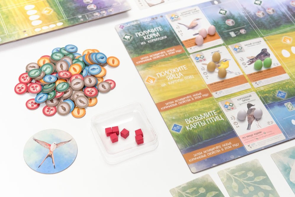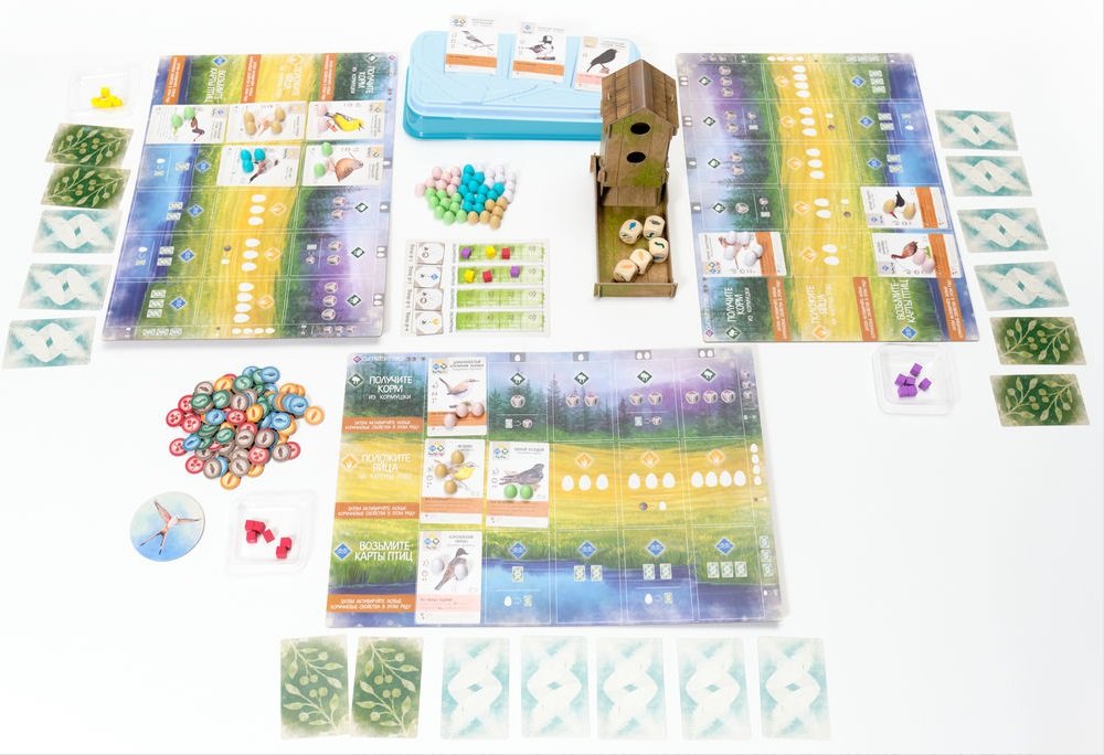 Наконец-то эта игра появилась в наличии! Лично мне она нравится яйками, вы сами все поймете когда увидите своими глазами) Атмосферы также добавляет роскошная башня-кормушка, которую собираешь сам, своими руками. О бумаге из которых сделаны правила и прочая макулатура в этой игре ходят легенды, такого раньше не видел нигде вообще! ИДЕАЛЬНАЯ - я б ее так описал. В общем и целом - к качеству не то что нет претензий - качество высочайшее, это же SM Games) Дальше - про игровой процесс. Механика игры строится на построении движка - игрокам нужно выкладывать карты в определенные 3 зоны, что б в следующий раз эта зона приносила более крутой бонус - либо больше еды соберете, либо больше карт возьмете, либо больше яиц выложите. Все просто и очень сложно одновременно, так как вечно думаешь какие карты, в каком порядке сыграть, в какую зону заселить эту чертову птицу и в какой момент надавать ей тумаков, что б она выдала побольше яиц. В игре мало прямого взаимодействия между игроками, это значит вам практически невозможно помешать в ваших грандиозных планах! Ну и отдельный плюс этой игры - это время подготовки: как для таких масштабов(я бы отнес ее, все таки, к серьезным играм), она очень быстро разбирается, а также рассказывается новичкам. Игра напоминает Эволюцию, так что имейте в виду, если нравится или слышали о такой. Чем напоминает? Каким-то общим духом игры, тематикой(естественно), мыслями в голове во время партии, планированием и той самой механикой построения движка! Отлично играется как вдвоем, так и в полном составе. Ничем не меняется ни тактика, ни стратегия, та-же самая игра, НО значительно увеличивается время партии, поскольку все начинают думать дольше и тщательнее (это еще 1 плюс игры - развивает навыки планирования, счета, память и внимательность)