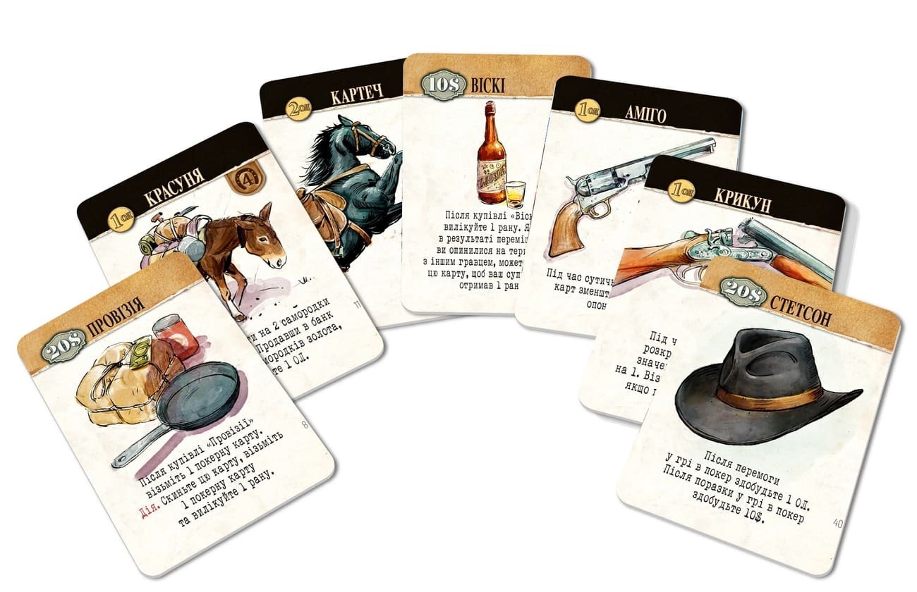 До речі, дана україномовна локалізація від WoodCat не тільки підкорює якістю всіх компонентів (а їх в грі достатньо) але і містить ексклюзивну покерну колоду. Загалом, в одній коробці на вас чекають золоті злитки, безкрайні простори прерій, стукіт копит, запах пороху і безліч способів стати Легендою Дикого Заходу!
