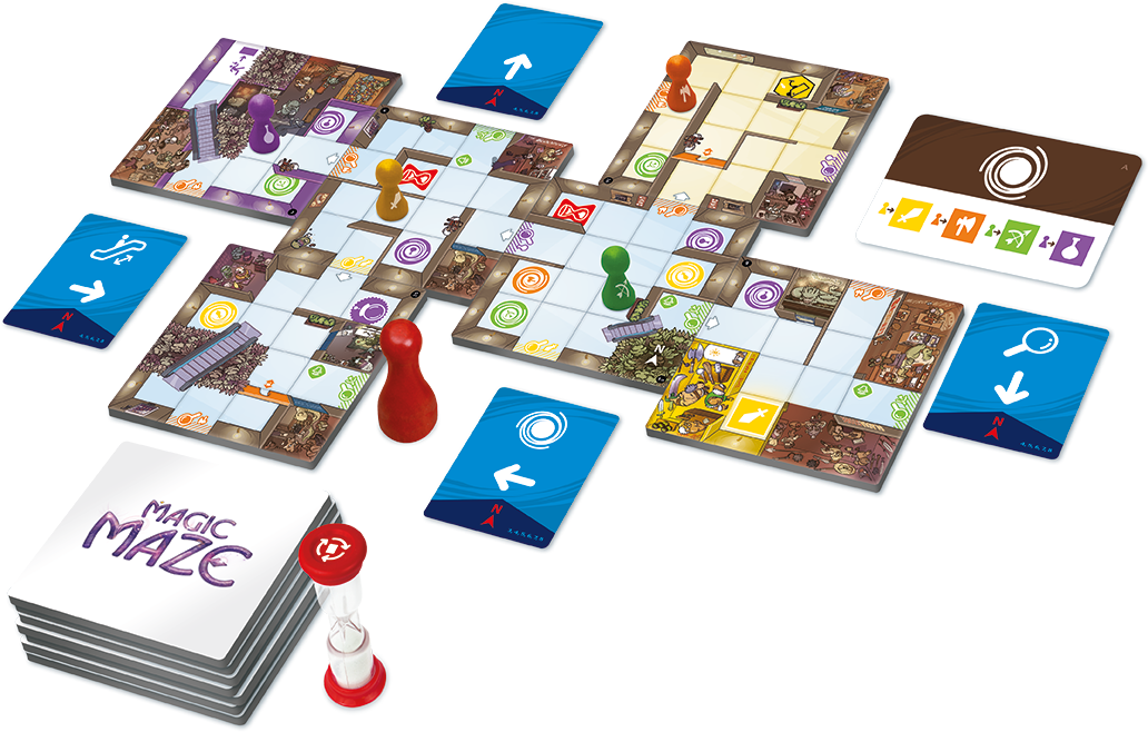 Допоможіть своїм героям не попастися в лапи дракона охорони в настільній грі «Magic Maze (МагоМаркет)»! Хоча зробити це буде не так-то просто. Лабіринти торгового центру заплутаніше похмурого підземелля, а камери спостереження - більш пильні ока Саурона. При цьому події в цій інноваційній кооперативній пригоді будуть відбуватися в реальному часі. Так-так, в настільній грі «Magic Maze (МагоМаркет)» гравці ходять одночасно, причому в повній тиші! І в цьому хаосі потрібно встигнути виконати загальну місію, поки не сплине тече час в пісковому годиннику. Причому поступово перед вами будуть відкриватися незвідані частини ігрового поля з новими перешкодами, магічними порталами і не дуже магічними ескалаторами.