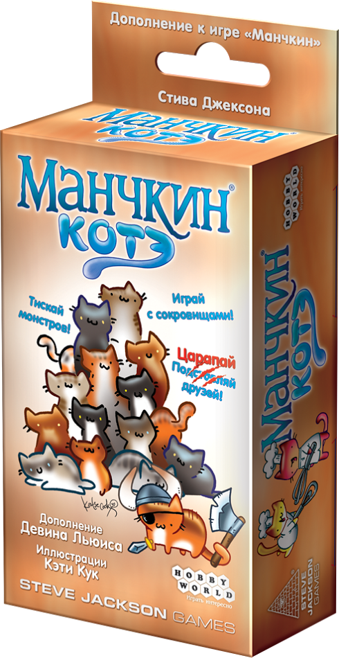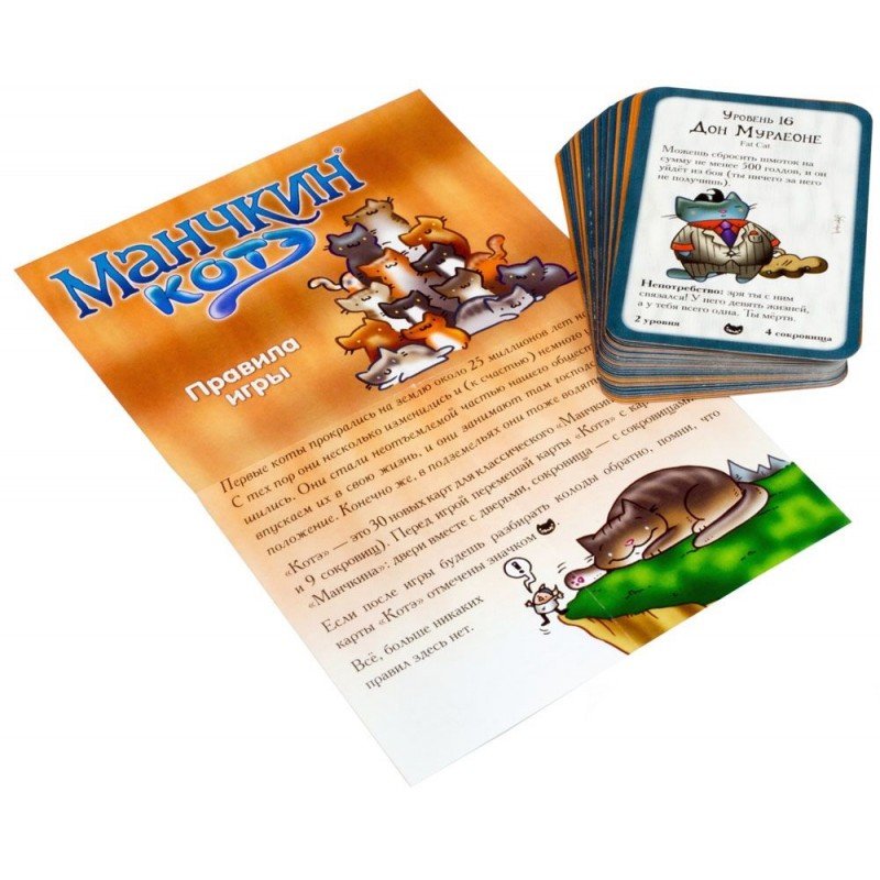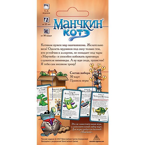 Ура! У світі манчкінів нарешті з'явилися ті, чиї фото все таємно дивляться в інтернеті. Забудьте про Памела Андерсон (якщо її ще хтось пам'ятає) і голих поп-зірки - зустрічайте котиків! Доповнення «Манчкін. Коте »готове урізноманітнити суворі будні трудівників підземель важкою порцією розчулення, мімішності і обмурликіванія. Цілих 30 карт нових дверей і скарбів з кошачим ухилом стануть справжніми ліками від туги, рутини і собачників. Хоча останні зможуть з особливим цинізмом замочити Кошенят-кухар або зачинити Дона Мурлеоне. Радості на всіх вистачить! Головне - встигнути сховати тапки.
