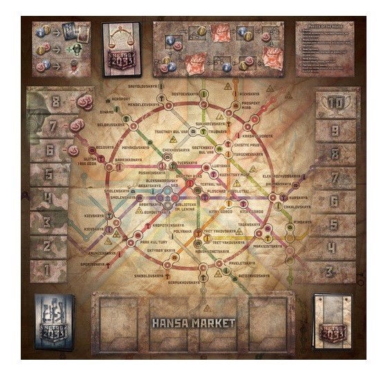 Якщо по книзі зробили комп'ютерну гру - значить, вона незвичайна. Якщо по книзі збираються зняти фільм - значить, сюжет у фільмі буде запам'ятовується. Коли, на довершення, по ній випускають настільну гру - її концепт точно вартий уваги! Перед Вами настільна гра Метро 2033! Прийшов час зануритися в постапокаліптичний світ Дмитра Глухівського, де внаслідок ядерної війни велика частина населення Землі була знищена, а поверхню планети пронизана радіацією через що остання стала непридатною для життя. Невеликі групи людей знайшли свій порятунок в заздалегідь підготовлених бункерах, а найбільша агломерація сформувалася в московському метро - єдиному масштабному притулок і останньої надії для збереження людського соціального ладу. Станції метро тепер грають ролі населених пунктів, жителі яких на грунті ідеологій і ресурсних баз розділилися на 5 конкуруючих фракцій, адже, як то кажуть: «Всього на всіх не вистачить, тому що всіх багато, а всього - мало! » Вам належить вибрати фракцію і героя. Також, в процесі гри ви будете вербувати солдатів для захисту своїх станцій і захоплення ворожих. Метою гри є захоплення найбільшої кількості станцій і утримання контролю над ними. Кожен хід складається з 5-ти фаз: Події: Фракції збирають ресурси, відображають нападу і приймають нові закони; Мобілізація: Гравці вербують нових солдатів і оплачують утримання армії; Дії армії: Гравці на свій розсуд направляють армії на захоплення ворожих територій або збір ресурсів; Дії Героя: Герой може переміщатися по станціях, торгувати спорядженням або вступати в бій Кінець раунду: Зміщення жетона раунду і перехід ходу до наступного гравця Крім конкуруючих між собою вижили, в підземеллях можна наштовхнутися на уражених радіацією тварин і так званих «чорних», - дивних істот з містичними здібностями. Небезпек тут не злічити! Барвиста атмосфера «Метро 2033» цілком і повністю поглине Вас глибиною своїх деталей і атмосферністю відбувається!