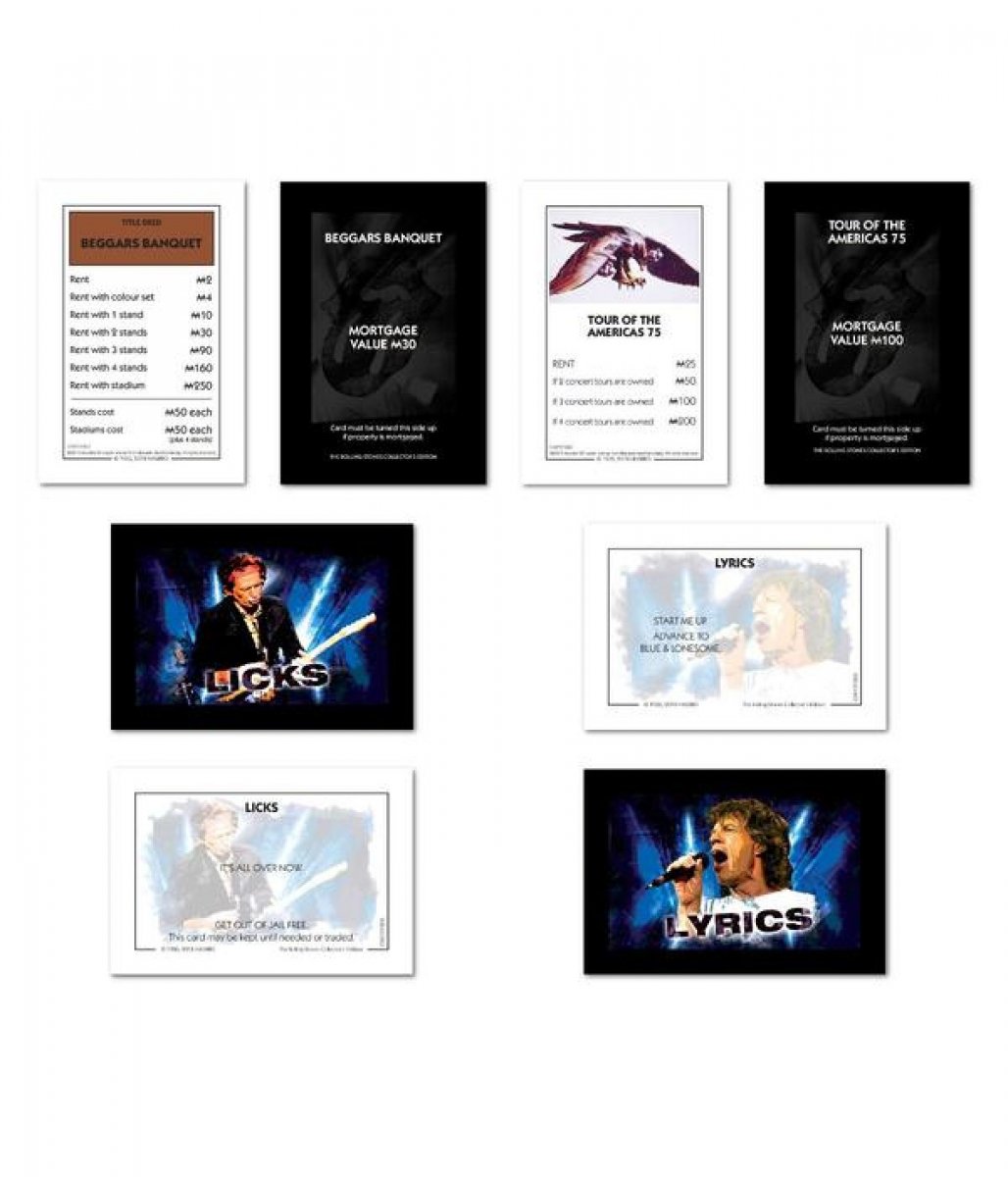 У Monopoly The Rolling Stones Collector's Edition на 2-6 гравців чекає спеціальне ігрове поле, присвячене творчості «роллінгів», квитки на їхні виступи замість грошових купюр і 6 металевих фішок гравців у вигляді символів, знайомих кожному шанувальнику Rolling Stones. Правила ж гри залишилися практично незмінними, тому вам не важко буде розібратися в них і вільно грати навіть в цю версію англійською мовою. Всі отримають задоволення від гри, а цінителі неперевершених Rolling Stones — у десятикратному обсязі!