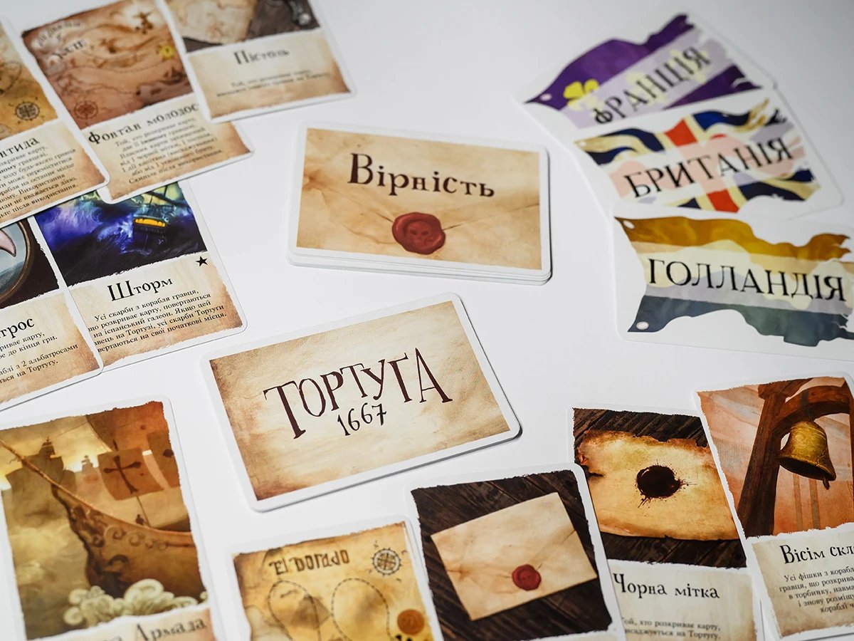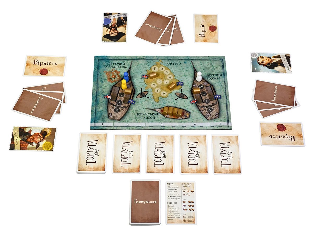 "Тортуґа 1667" — це атмосферна настільна гра, де ти потрапляєш на борт піратського корабля в Карибському морі часів Золотої доби піратства! Три команди — французи, англійці і голландці — борються за контроль над іспанським галеоном, повним золота. Але будь обережним! Лояльність постійно змінюється, зрада чигає за кожним рогом, а на кораблі можуть бути шпигуни...