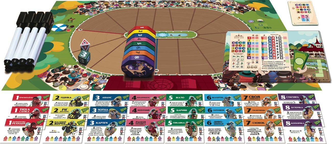 Ігровий процес Формат гри — гоночна настолка з елементами тактики та трохи хаосу. Гравці обирають унікальних верхогонів, кожен з особливими здібностями, і змагаються на динамічному треку, який може змінюватися під час гри. Основні механіки включають рух карткам, спеціальні дії та постійну взаємодію між гравцями. Партія триває 30-45 хвилин і розрахована на 2-6 гравців — ідеально для веселої компанії будь-якого віку!