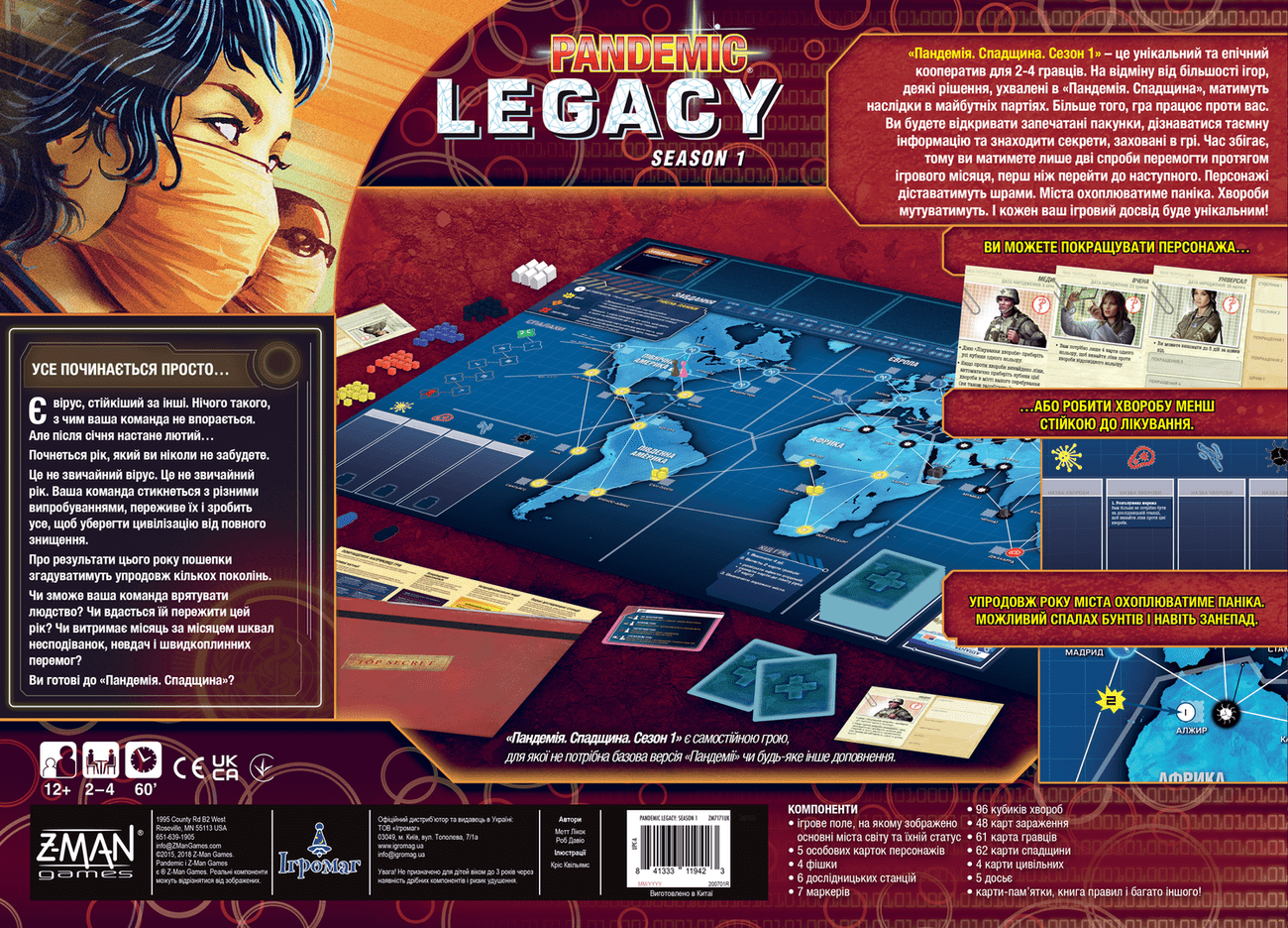 "Пандемія: Спадщина. Сезон 1" — це революційна настільна гра, яка розгортається як захоплюючий серіал з 12-24 партій! Це не просто гра, а повноцінна кампанія, де твої рішення мають незворотні наслідки, персонажі розвиваються, а світ трансформується під впливом ваших успіхів та невдач. Станьте командою медиків та науковців, щоб врятувати людство від смертельних вірусів!