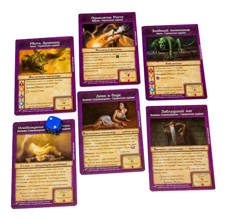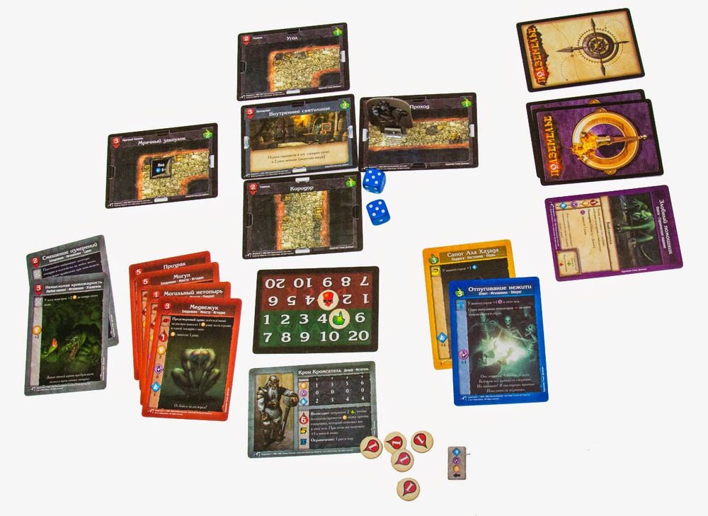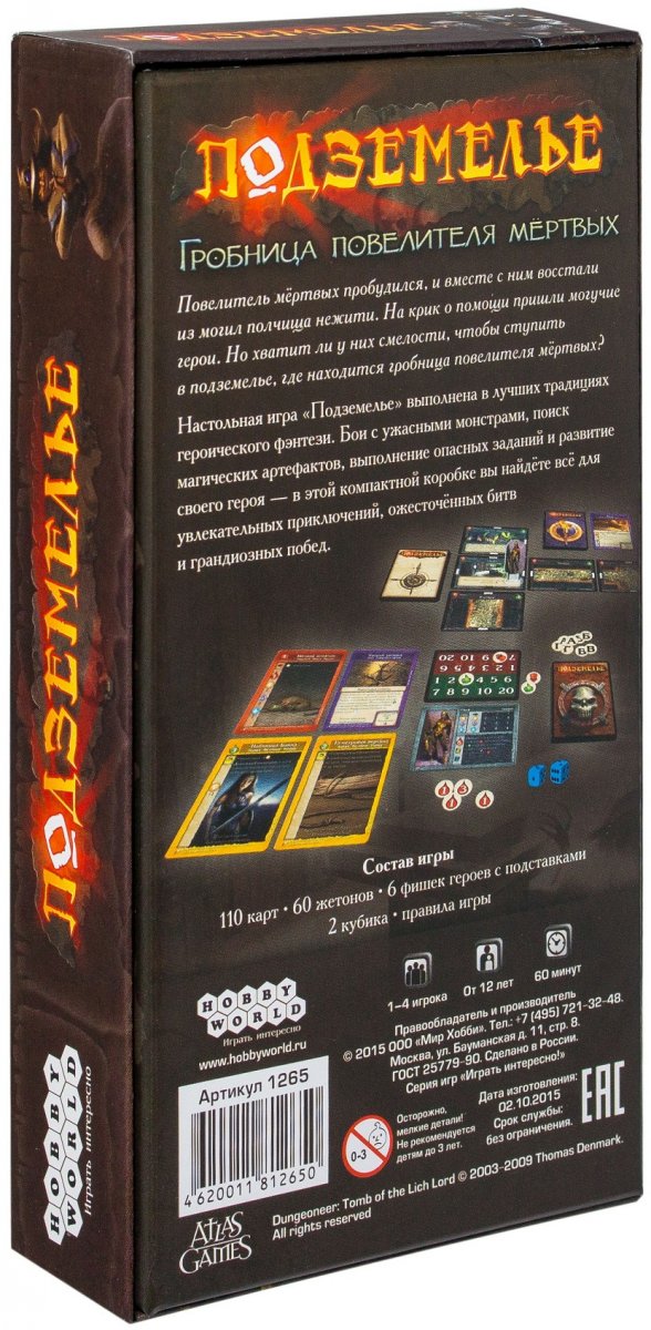 Маленька коробка, велика пригода! Це опис повністю відповідає захоплюючої настільної гри «Підземелля. Гробниця Повелителя мертвих ». У компактній упаковці помістилося все необхідне для фентезі-подорожі: карти локацій, пригод і завдань, кубики, фішки героїв (6 унікальних персонажів) з підставками і безліч жетонів, лаконічне, але атмосферний оформлення яких радує очі і обіцяє дійсно захоплююча подорож до 4-х людин. Куди ж відправляться наші герої? Як можна здогадатися з назви, в темне підземелля, поступово відкривається перед ними, і що зберігає в собі безліч таємниць, небезпек і артефактів. Завдання гравців - виконати три завдання швидше суперників, які, до речі, в кожен свій хід також будуть вершити злодіяння від імені пробудившегося Повелителя мертвих, а значить так просто перемогти не вийде. Гравцям належить битися з монстрами, розвивати своїх героїв, вершити подвиги і не тільки намагатися вижити в небезпечних катакомбах, а й прийти до перемоги. А якщо раптом захочеться скоротати вечір в поодинці, то творці гри передбачили варіант гри для одного учасника. Так що причин не грати тепер не буде - сміливо вирушайте в «Підземелля»!