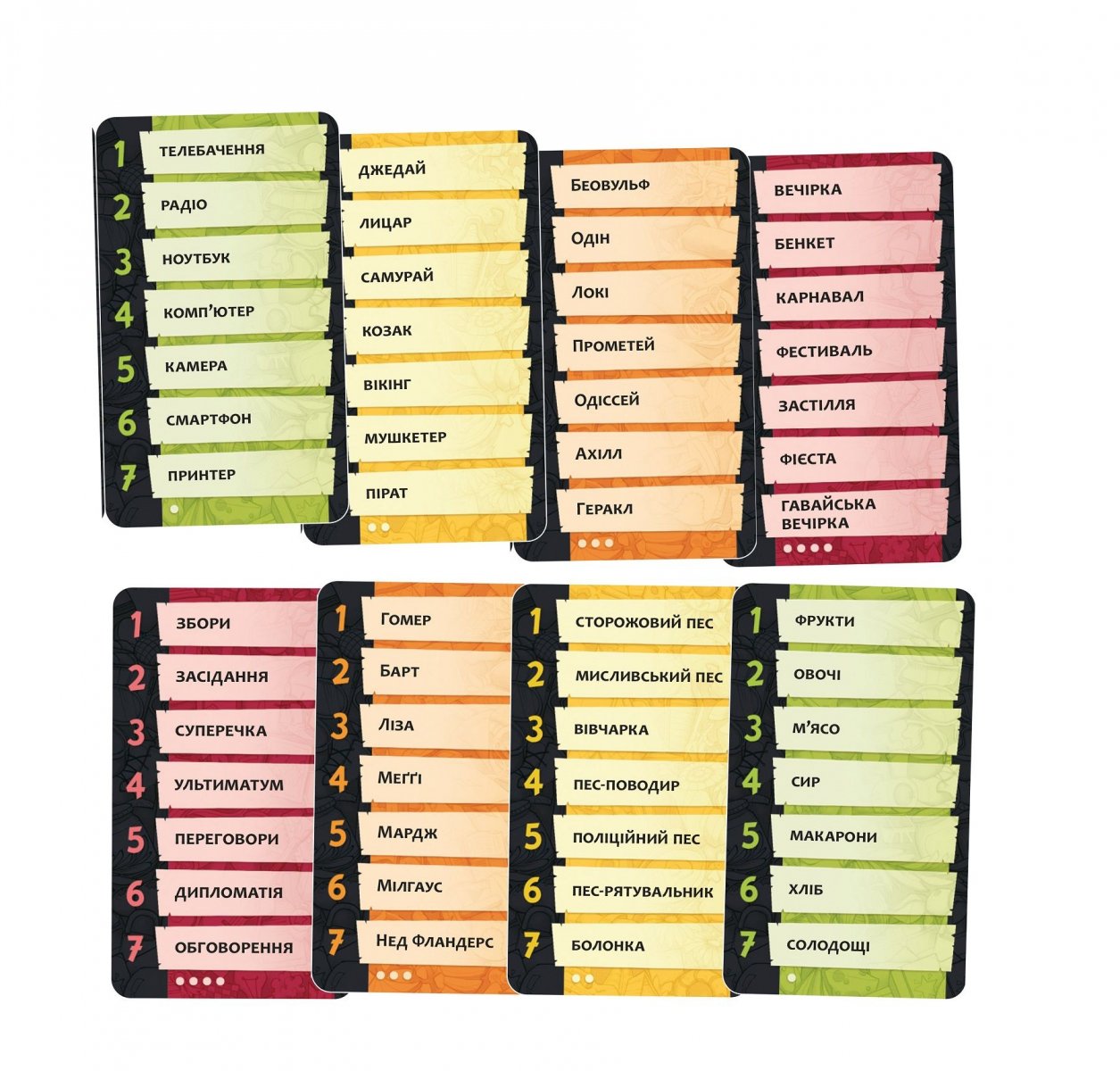 По інтересах: | Для вечірки, Сімейні, Асоціації, Вікторина, Гумор, Для компанії, Для новачків, Для підлітків, На спритність, Швидкі |
