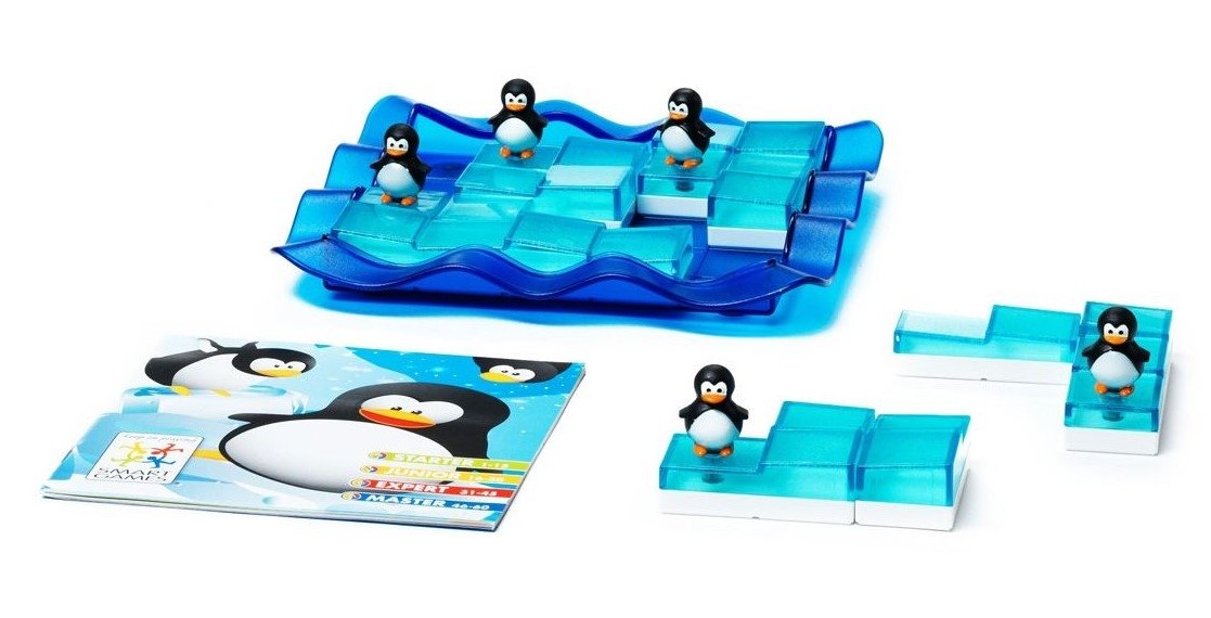 Допомогти милим пінгвінам - справа свята. Тим більше коли цей процес обіцяє море позитивних емоцій і тренування логічного мислення для малюків від 6 років. Всього-то й потрібно: відкрити коробку з настільною грою «Пінгвіни на льоду», дістати ігрове поле, розкласти 5 рухомих частин крижини з пінгвінами і уважно подивитися на першу картинку із завданням. Необхідно заповнити поле розміром 5 на 5 клітин крижаними шматочками таким чином, щоб прекрепленние пінгвіни виявилися на відповідних зображенні місцях. Начебто завдання спрощується тим, що фраменти крижини рухливі, але 48 завдань розділені на різні рівні складності, тому гарненько потренувати своє просторову уяву вийде навіть у дорослих. Компактність гри дозволить взяти її з собою, в дорогу або на відпочинок, а симпатичне оформлення і милі герої не залишать байдужими навіть найбільших непосид. «Пінгвіни на льоду» підкорять всіх!