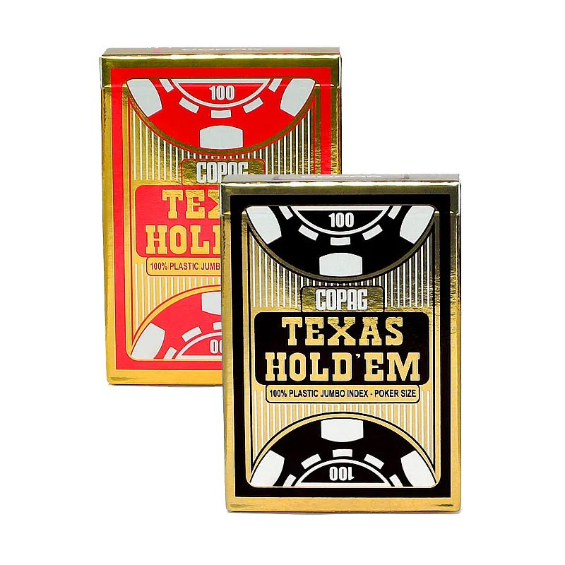 Це особливо важливо, якщо на них потрапляє волога (азартні ігри — вони такі, легко призводять до підвищеного потовиділення). У Copag Texas Hold'em класичний дизайн, а сорочка виконана з білим кантом. Ці пластикові карти мають збільшений індекс і 54 карти в колоді. Розмір класичний покерний, що й не дивно: це одні з найбільш популярних карт, які використовуються в європейських турнірах з покеру.