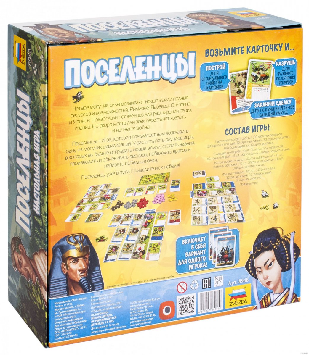 У грі «Поселенці (Поселенцы)» вам належить очолити 4 асиметричні нації та привести свою імперію до світової могутності. Для цього єгиптяни, римляни, японці та варвари будуватимуть і руйнувати різні споруди, вироблятимуть ресурси та обмінюватимуть їх, нападатимуть на суперників і захищатимуться від агресорів. Все як в класичних містобудівних стратегіях, але «Поселенці» особливо сподобаються тим, хто любить створювати багаторівневі комбінації з карт. Так, в коробці з грою ви знайдете і дерев'яних міплів, і розсип ресурсів, і купу жетонів, але суть гри полягає в побудові вашого унікального карткового движка.