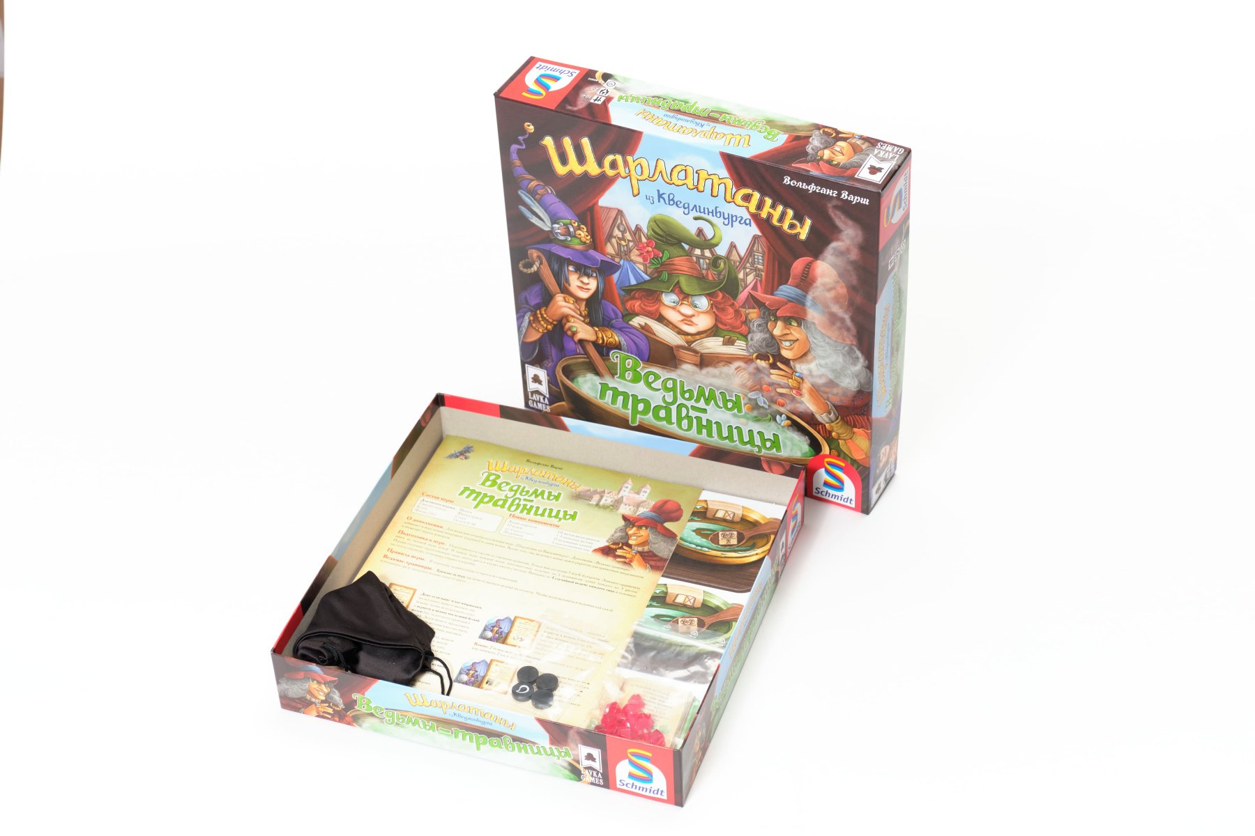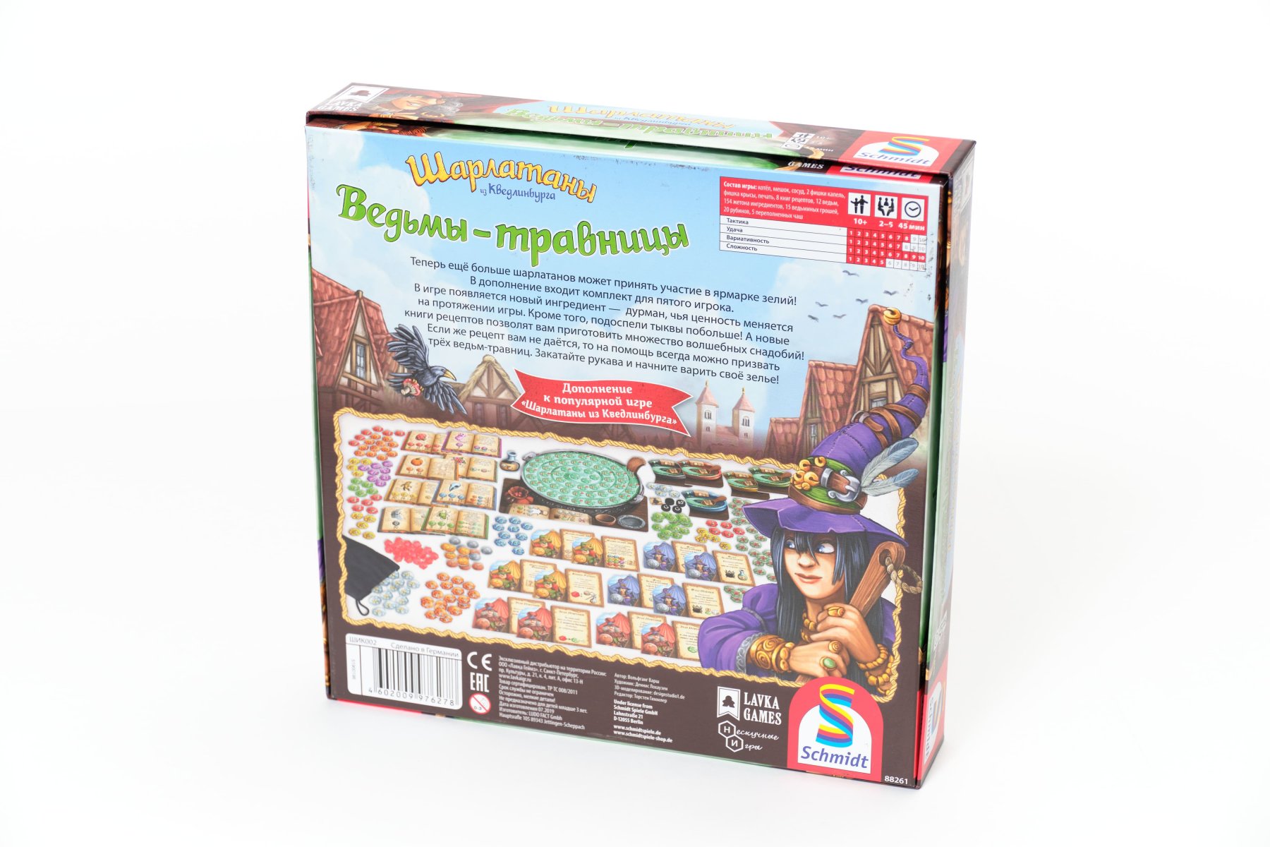 Так, тепер на ярмарку з'явиться ще один шарлатан! А значить, змагатися у виробництві зілля буде ще цікавіше. У коробці ви знайдете всі необхідні компоненти для 5-го гравця, але це, звичайно ж, не все! Доповнення «Шарлатани з Кведлінбурга. Відьми-травниці» вводить в гру новий елемент зілля — дурман, додаткові книги рецептів, позначення переповнених чаш на 33-му рівні котла і, звичайно, прекрасних жінок. Тобто 12 відьом 3-х кольорів, які готові всього лише за монетку відповідного кольору надати послуги різного корисного роду. За допомогою травниці варити зілля десь стане простіше (все-таки вони професіонали), та й на етапі підрахунку очок ці дами зможуть стати в нагоді. Так що коробка «Шарлатаны из Кведлинбурга. Ведьмы-травницы» допоможе вам багато в чому: десь шахрувати, десь запаморочити розум, а десь заманити у свої псевдомістичні (але істинно захопливі) справи ще одного зіллєвара. І правильно: чим більше народу на ярмарку, тим він веселіший!
