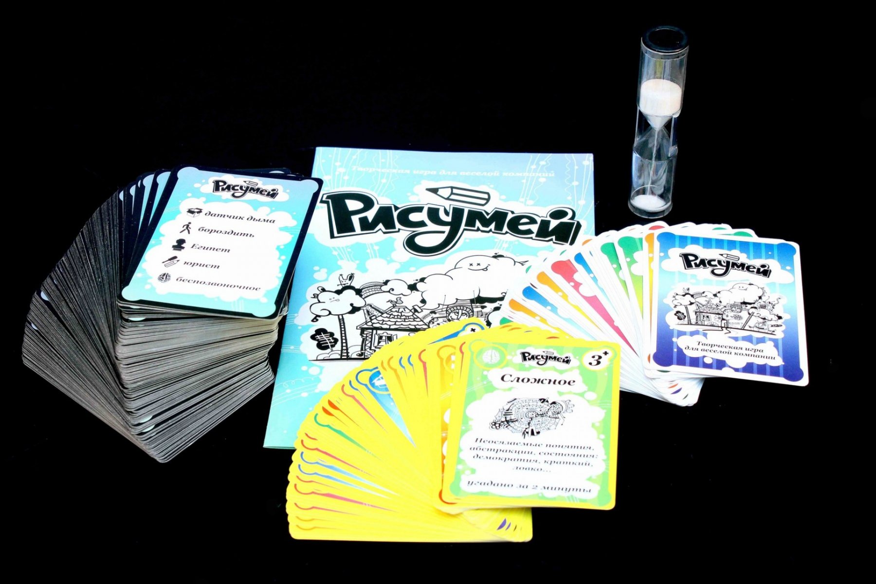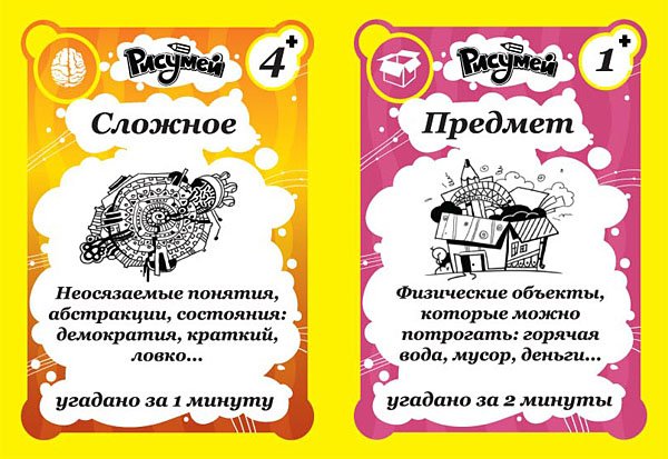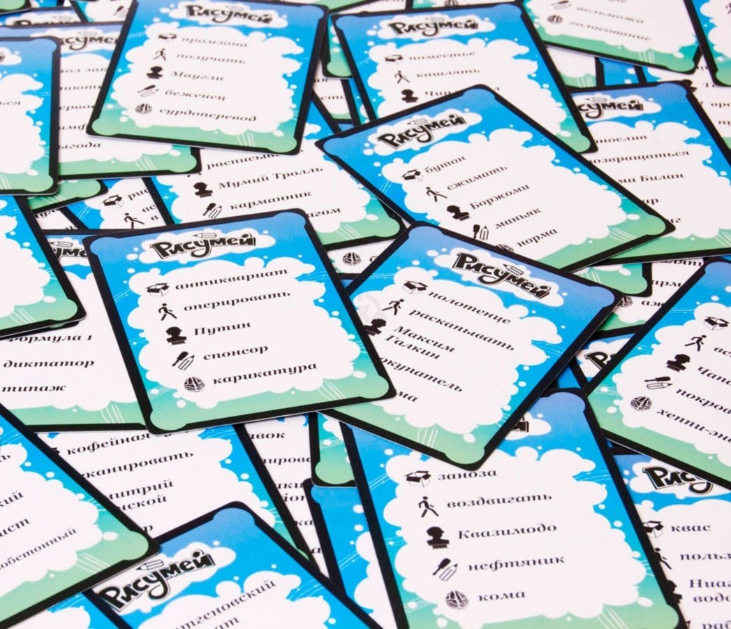 Вам належить розділити свою компанію з 4-16 чоловік на команди (мінімум по 2 гравця) і змагатися в тому, наскільки зрозуміло ви малюєте, намагаючись зобразити слова з 200 двосторонніх карток. І робити це потрібно якомога швидше! На кожному обороті картки буде по 5 завдань різної складності, відгадування яких буде винагороджуватися різною кількістю балів. Адже, наприклад, намалювати предмет набагато простіше, ніж зобразити прикметник «залізобетонний». Причому щоб коробку з грою «Рісумей» можна було легко взяти з собою в дорогу, творці замінили ігрове поле для підрахунку очок на карти з балами. На них під смішними малюнками написана категорія слова, час, за який вона відгадати, і скільки очок принесло команді - дуже зручно!