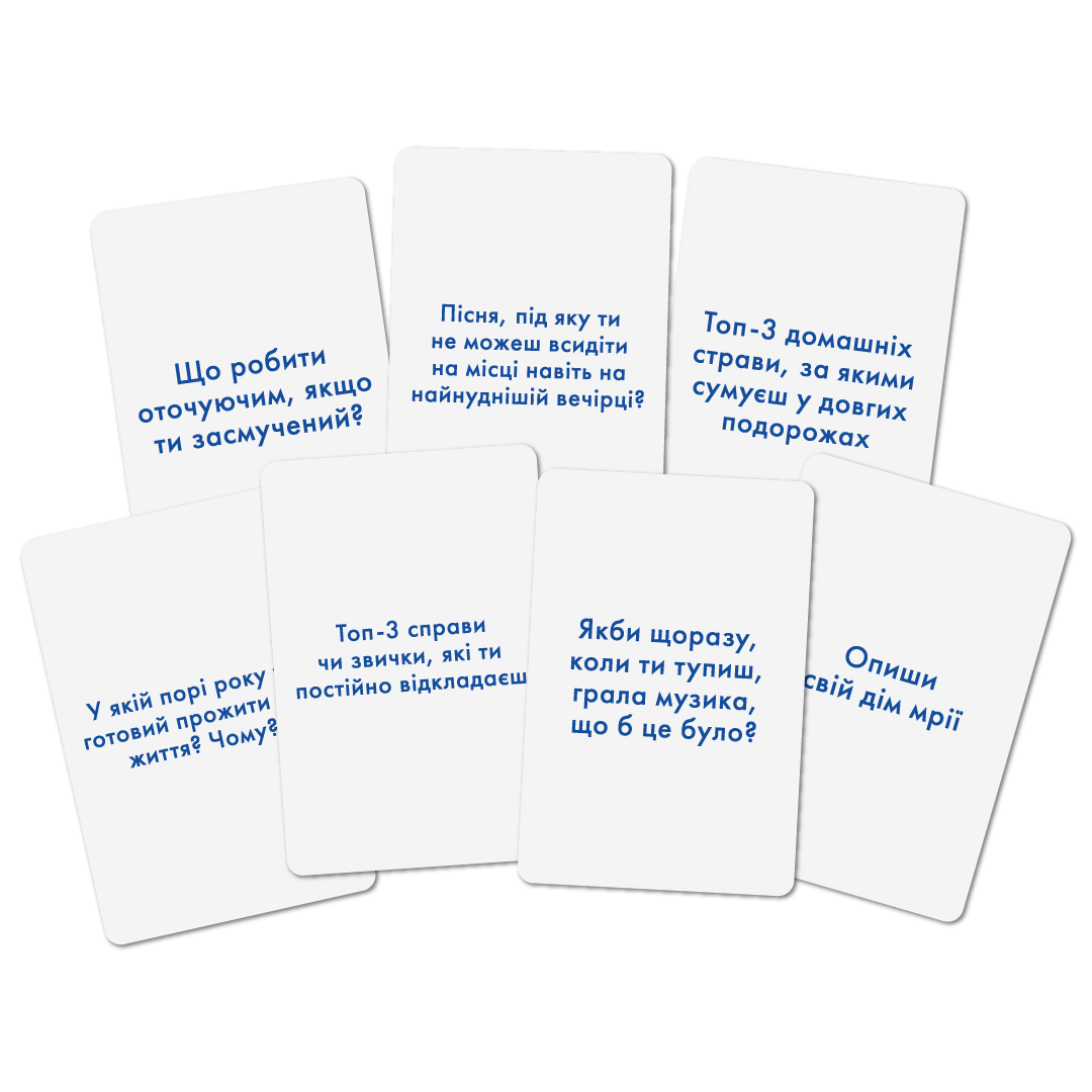 Ігровий процес простіший за твоє ранкове вставання на роботу: витягуй картку, зачитуй питання і насолоджуйся, як твої друзі викручуються, намагаючись відповісти..прийнятно!) У грі 150+ карток з яскравими запитаннями різної категорії складності. Ось кілька прикладів питань: