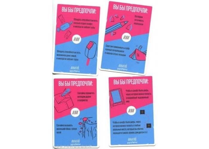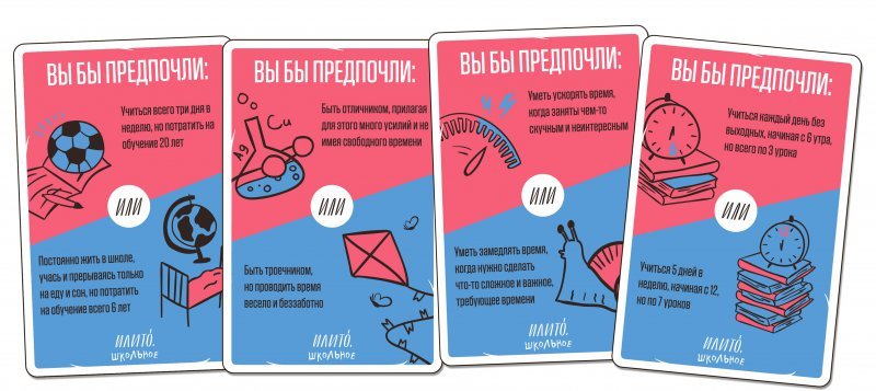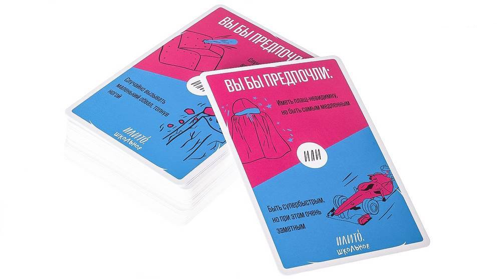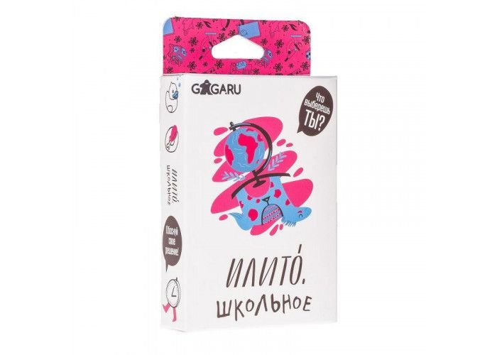Что выберете: один раз выиграть огромный главный приз в лотерею или чтобы везло в мелочах, но всегда? Имей вы суперсилу, хотели бы превращать воду в лёд одним прикосновением или заставлять её закипать? Давайте выясним, кто из вашей дружной компании займёт одну из двух сторон, предложенных в разговорной карточной игре «ИлиТо Школьное» от издателя GaGa Games! А Ход Конём уверен, что мнения разделятся. Очко в раунде, разыгранном по одной из карт, получит тот из 3-17 игроков, кто наиболее искусно привел аргументы в пользу именно своего варианта.