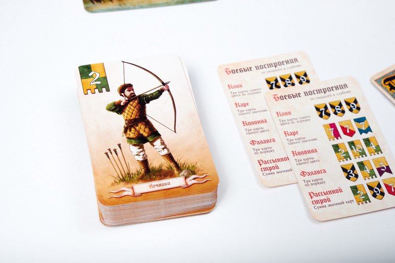 Комбинации воинов называются построениями и бывают 5 типов и разной силы. Например, самое сильное боевое построение — это клин, то есть три карты одного цвета по порядку, а самое слабое — рассыпной строй, то есть три отряда без порядка и разной масти. Игроки по очереди выкладывают карты, формируя построения, и добирают карты из общей колоды. Но кроме отрядов у вас будут также карты тактики с особыми бонусами, которые внесут в ваши ходы ещё больше разнообразия, а в партии — непредсказуемости. Тот кто захватит три карты подряд или 5 территорий в сумме — сможет праздновать победу, но до этого момента вам предстоит тщательно обдумывать свои действия.