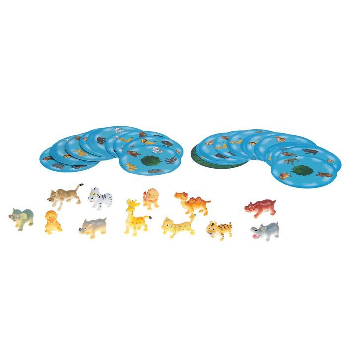 - 12 фигурок зверей- 34 круглые карточки с изображениями разных зверей