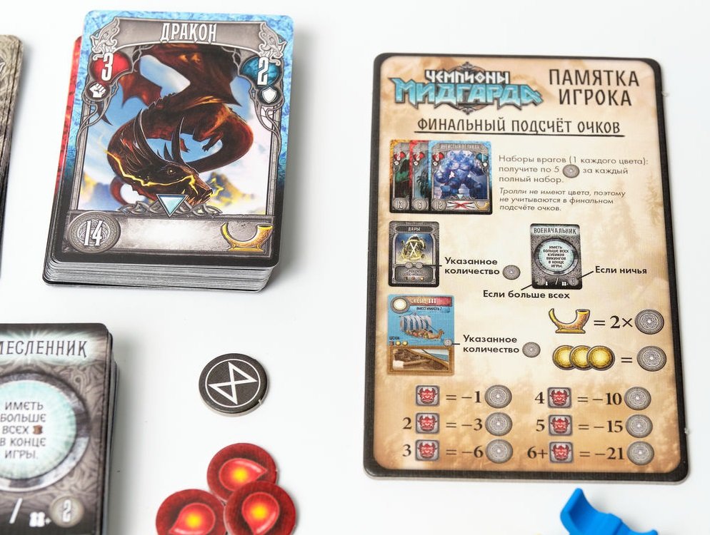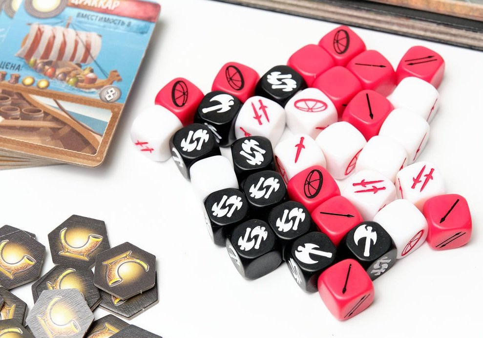 Битвы с монстрами будут тоже проходить не по-детски: на специальных кубиках, но с многочисленными жертвами. Причем те, кто, например, не одолеют тролля, ещё и получат жетоны позора. Из карт побежденных врагов вам предстоит собирать разноцветные сеты, которые, как и деньги, руны, корабли и выполненные карты тайных заданий, принесут вам в конце игры очки славы. А кто не хочет стать самым прославленным вождем и попасть в небесный чертог Асгарда? Точно не настоящие Чемпионы Мидгарда. Они готовы играть в эту замечательную игру, пока их не призовет сам Один. То есть множество потрясающих партий.