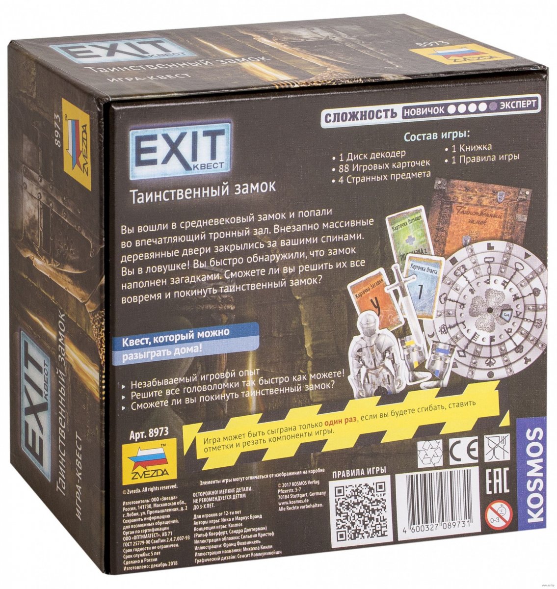 В игре «Exit. Квест — Таинственный замок» 1-4 игроков ждут карты с разнообразными головоломками, решение которых поможет придумать, как выбраться из западни. Кроме 88 карточек (с задачами, подсказками и ответами) в коробке с игрой вы также найдете 4 загадочных предмета (не разглядывайте их раньше времени, но приготовьте ножницы), диск-декодер (где вы будете проверять свои догадки) и старый дневник. Начинайте читать последний и следуйте инструкциям.