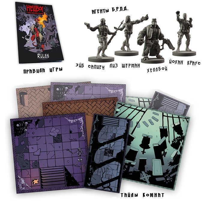 В коробке с игрой вас ждет 2,5 кг сплошного удовольствия и кооперативный данжен-кроулер с 6 уникальными сценариями. «Хеллбой» выполнен в стиле америтреша, поэтому 1-4 игрока смогут насладиться 20 высокодетализированными миниатюрами агентов БРПД и монстров, которые будут перемещаться по локациям и биться на кубиках. Задача команды игроков — расследовать мистические дела, отражая нападения приспешников зла, чтоб в финале сразиться с одним из боссов и уничтожить всех врагов. Тут вам встретятся и Распутин, и гигантская лягушка, и... впрочем все 6 сценариев строго засекречены, пока вы не вступите в ряды БРПД. Так что Ход Конем не может раскрыть вам больше информации, кроме того, что в колоде миссий всегда будут присутствовать случайные карт, поэтому сценарии интересно проходить по несколько раз, а в сражениях на кубиках фактор удачи сведен к минимуму и главным останется правильность выбранной стратегии и тактики.