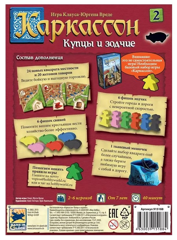 Новые тайлы местности и фишки товаров для торговли, а также симпатичные фигурки розовых свинок, которые принесут дополнительные очки, идут в комплекте с 6 новыми миплами- зодчими. Эти средневековые архитекторы помогут игрокам строить поселения и дороги ещё быстрее. Кроме того, в коробке с дополнением «Каркассон. Купцы и зодчие» вы найдете текстильный мешочек, который не только поможет спрятать тайлы от любопытных глаз и вытягивать их абсолютно случайно, но и позволит брать игру с собой в дорогу!