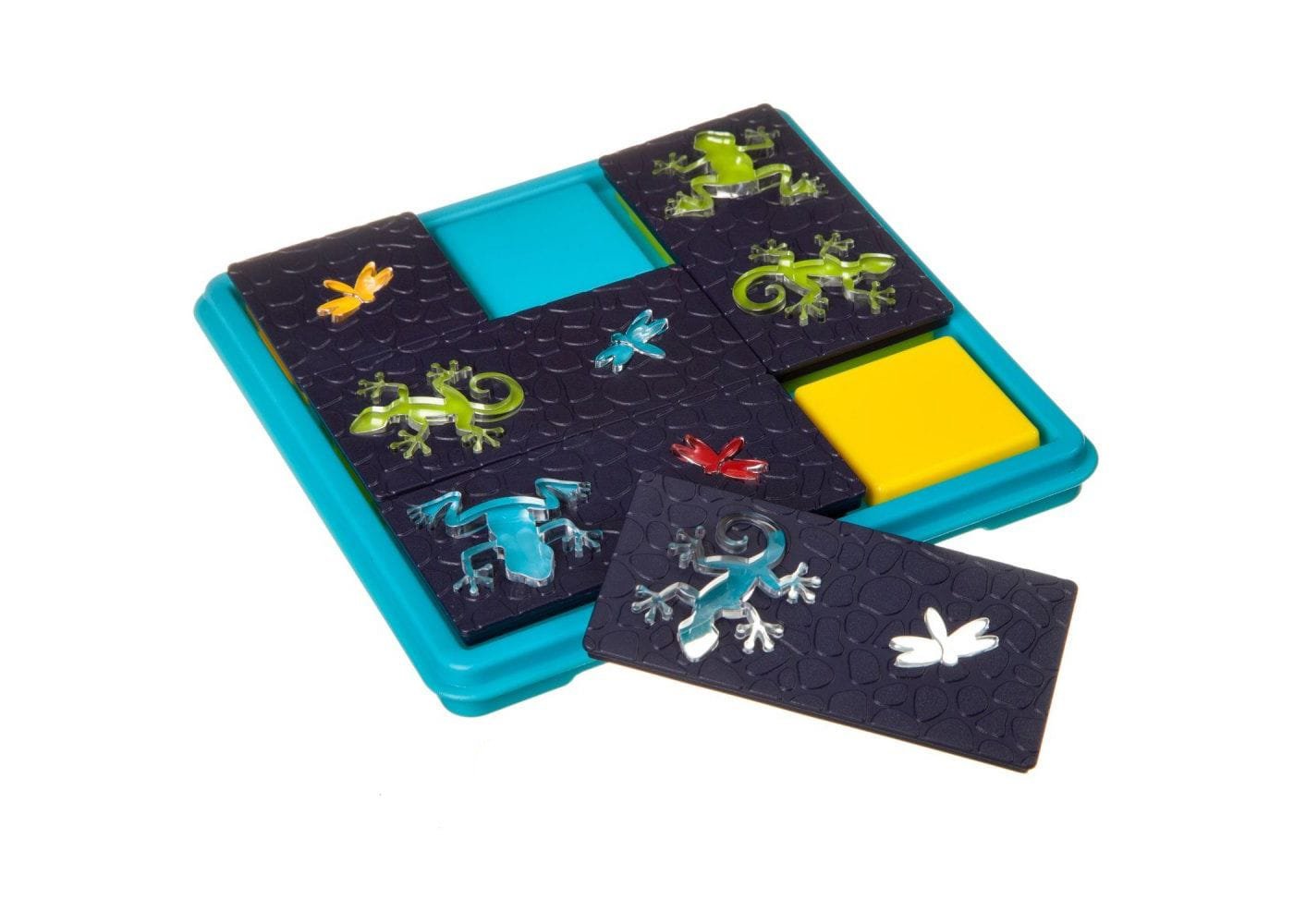 – Игровая доска с цветными квадратами и прозрачной крышкой– 5 элементов головоломки с прозрачными лягушками, саламандрами и бабочками