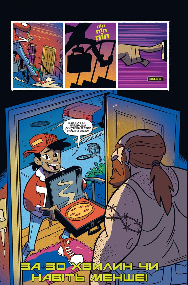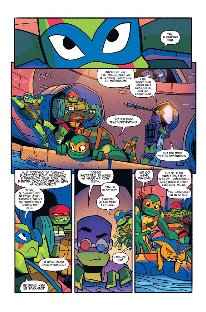 Окрім важливих справ вони також хочуть потішити самих себе, а саме – дізнатися, яка піцерія здатна найшвидше доставити свіжу смачну піцу. Раф, Донні, Лео та Майкі дуже серйозно відносяться до своєї улюбленої їжі, тому для них це дуже важливо!