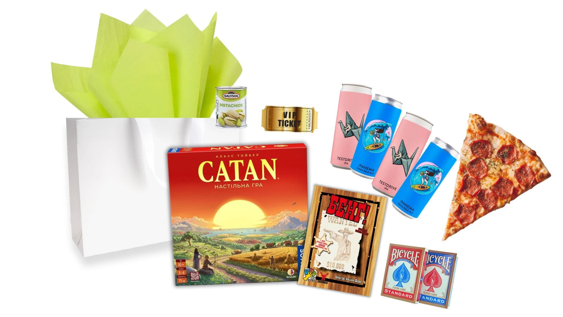 Чтобы батлы проходили ещё вкуснее, в набор включён сертификат на пиццу, а также крафтовое пиво от Varvar Brewery — по две бутылки «Ипанема» и «Тестдрайв». Дополнительный сюрприз — VIP билет-лотерея, который делает подарок ещё интереснее. Всё это — в стильном подарочном пакете, готовом к вручению.